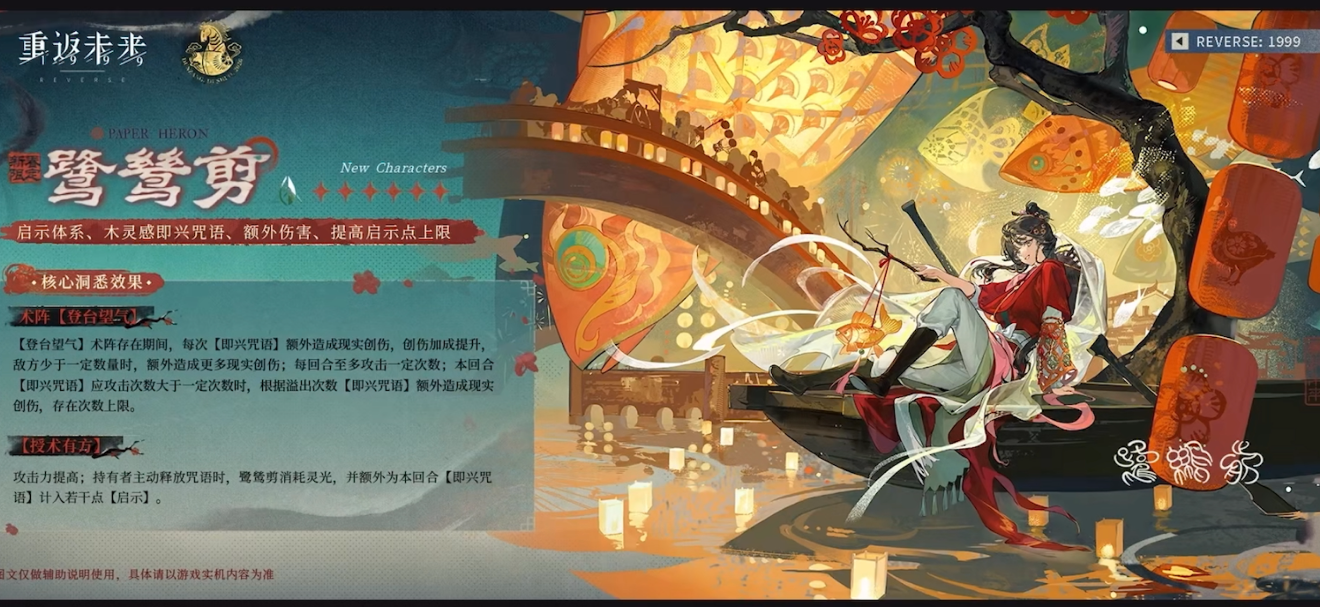 新春限定鹭鸶剪核心机制:启示体系、木灵感即兴咒语、额外伤害、提高启示点上限【登台望气】术阵存在期间,每次【即兴咒语】额外造成现实创伤,创伤加成提升,敌方少于一定数量时,额外造成更多现实创伤;每回合至多攻击一定次数;本回合【即兴咒语】应攻击次数大于一定次数时,根据溢出次数【即兴咒语】额外造成现实创伤,存在次数上限。总的来说 鹭鸶剪是新的启示队主C 需要用仪式一直保持术阵开着 通过全队积攒启示点