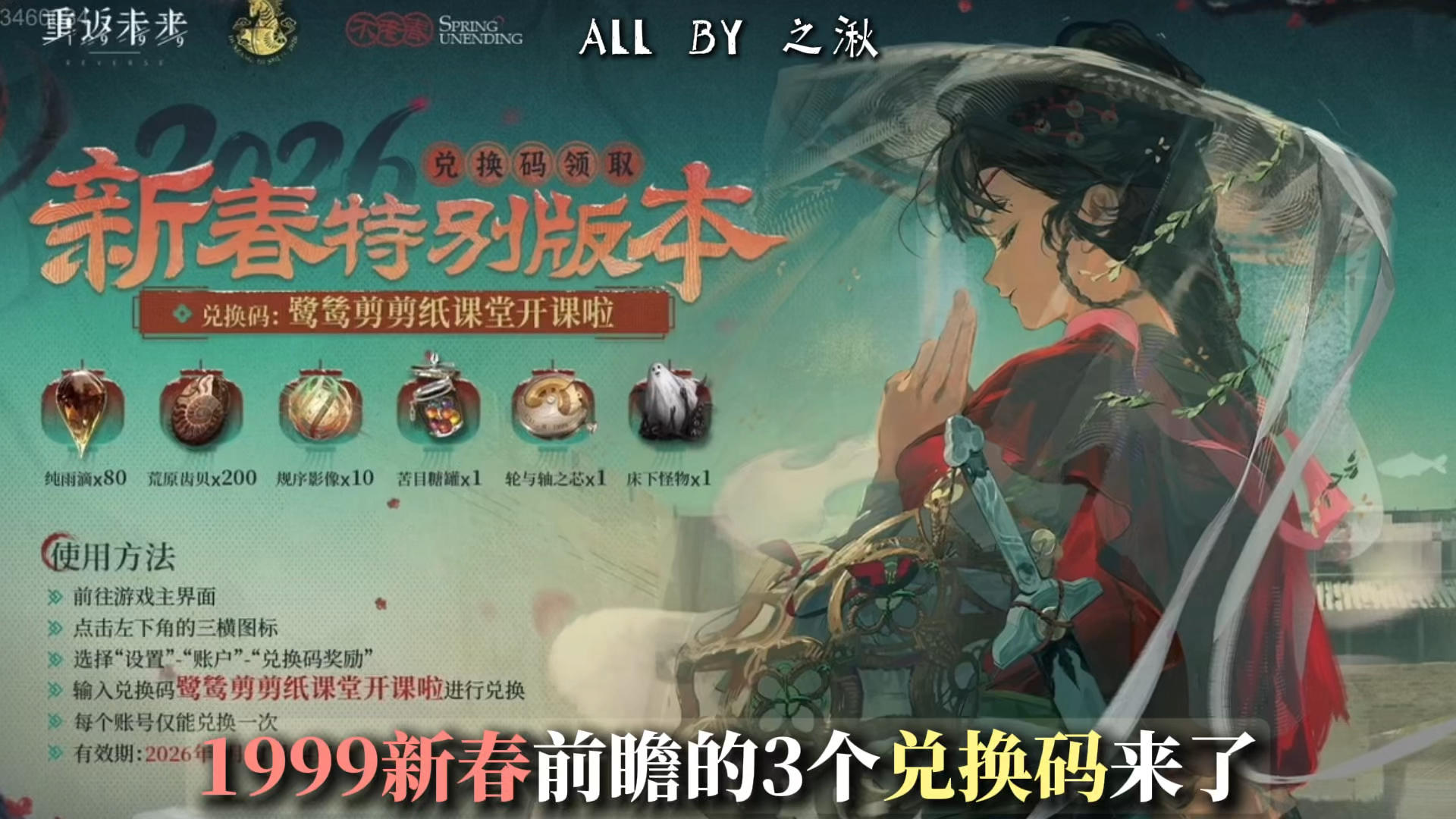 大家好呀! 这是重返未来2026新春特别前瞻节目兑换码。等直播开始之后,我会将兑换码发在笔记的照片,正问和评论区中,请各位记得查收。最后祝各位司辰欧气爆棚,单抽出金,十连满塑!✨————————————————————————⏰兑换码将于2026年1月11日24点之前有效,请各位司辰及时兑换!▪️兑换码1: 鹭鸶剪剪纸课堂开课啦▪️兑换码2: 小程巡检巡检中▪️兑换码3: 1月20日