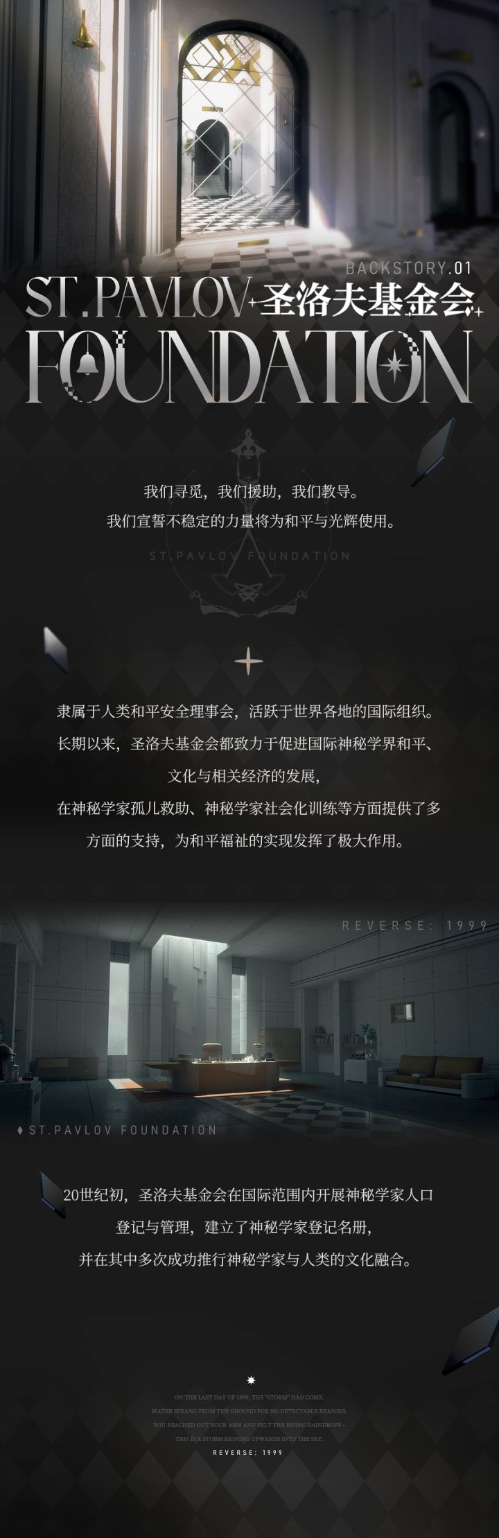 //时代梭巡须知一些关乎常人世界与神秘学界的笔记,在启程时刻翻阅,或许能为您将行的旅途开启门扉。Chap.05:圣洛夫基金会★前往预约★★了解更多★官方微博:重返未来1999官方公众号:重返未来1999官方网站: