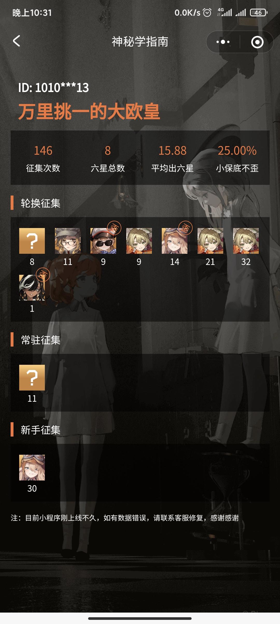 我去,真的烦死了。本人特别喜欢未锈铠很早就开始攒抽和升级材料,结果up池一出歪了个百夫长,然后今天我又攒了个十连想着试试(没到保底)结果手误抽错池子了,结果出了个梅兰尼。说运气不好吧,百夫长和梅兰尼都不是保底出的强度也还行,但说运气好吧,up的未锈铠因各种奇奇怪怪的问题抽不出来