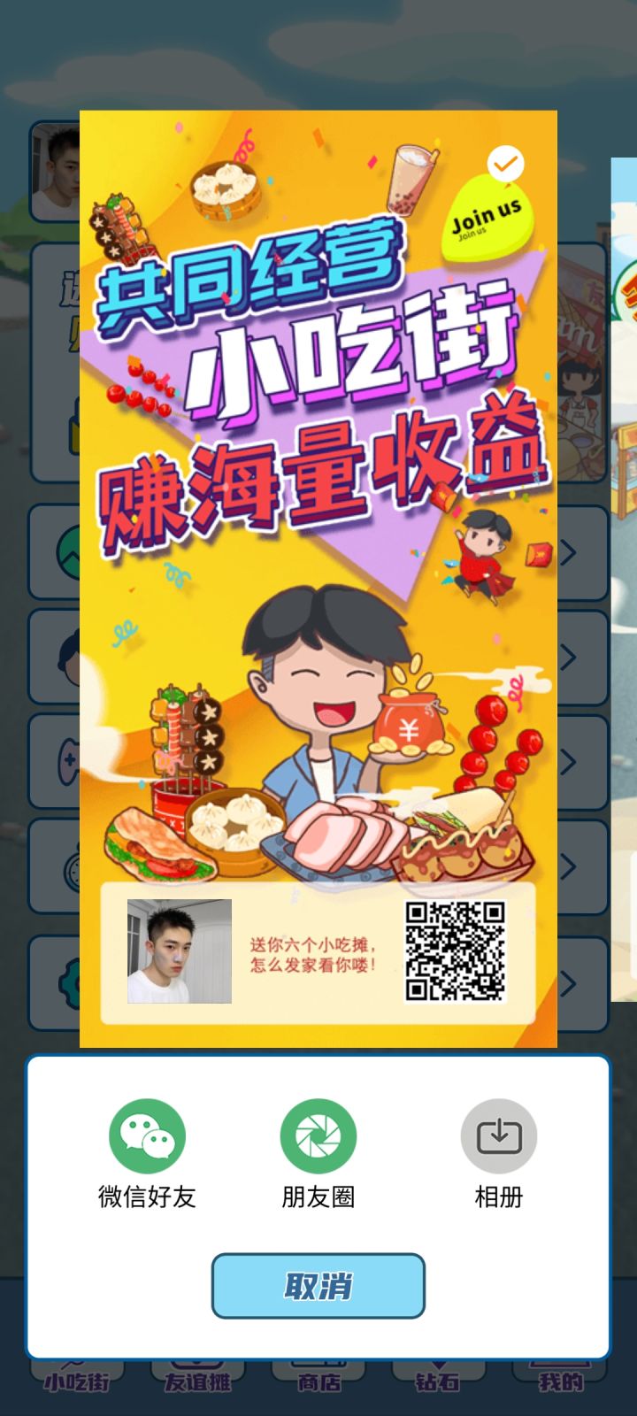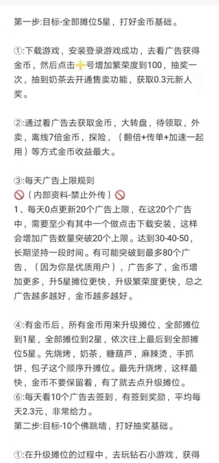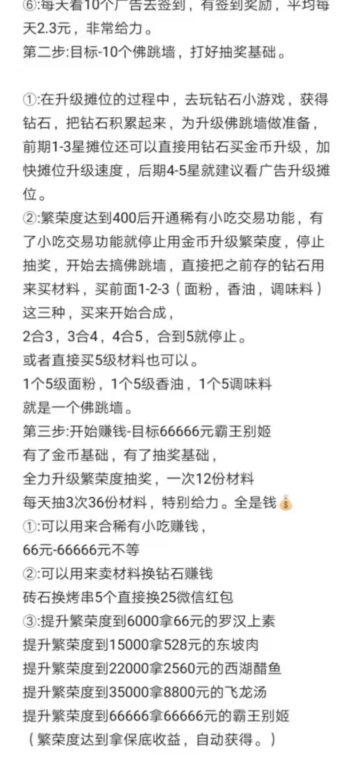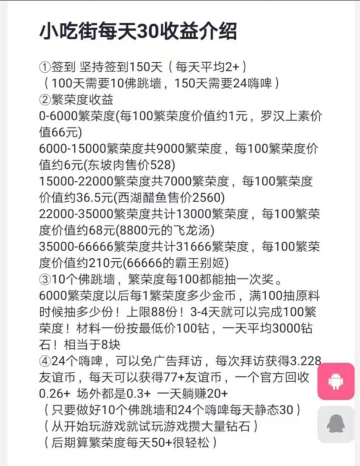 先给大家看一下收益图快扫描二维码加入游戏吧!!!扫描二维码加入游戏,每升级一个5星摊位找我领2元红包,一共六个摊位是12。记住,每升级一个五星领一次!!!进入游戏会送一个新手小吃,售卖0.3,进入售卖秒到微信(必须)。<如何快速获取金币>先一句话总结一下:前期升级五星摊位,中期搞佛跳墙和嗨啤,后期搞稀有小吃售卖。具体详情看下面。一:利用好15个广告。1:维护小镇里+3+4+5各用一个。