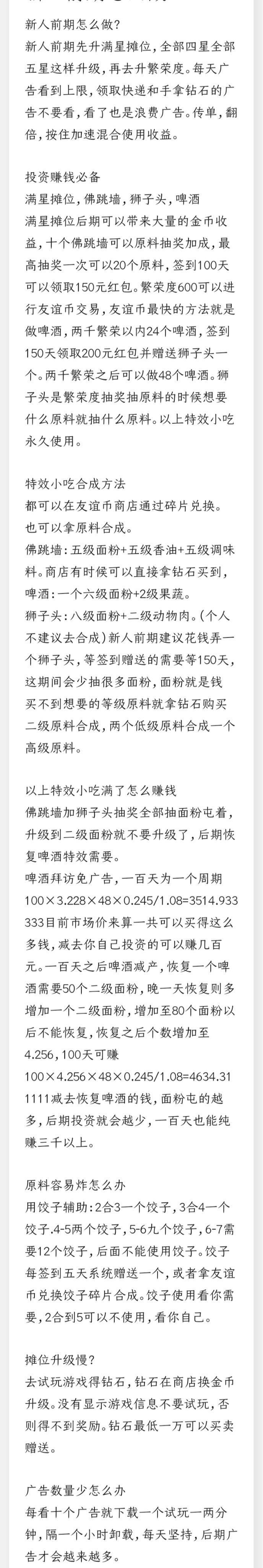 赚钱方法详解,这个能进入游戏列表是我万万没想到的,,,也侧面说明了这游戏稳定不会跑路,不跑路的话弄啤酒一个啤酒五十块左右,每天访问能获得3.22友谊币黑市0.24一个有人无限收,相当于一天0.75元六十多天后就是纯利润(这只是一个啤酒)最高可以48个啤酒,弄满一天35元左右,60多天后一天赚35.....直到永远不香吗,,,,这还只是友谊币有的人专门买低级材料合高级材料后卖材料每天也赚不少钻石,钻