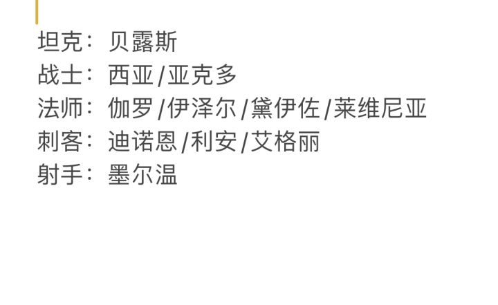 ①坦克,贝露丝:能抗能打能加血 ;四技能【神圣庇护】被动解锁后被打还能回复;三技能【统御战场】位移空降救场保护队友添加一次抵挡技能二回合 buff.并少量回复范围队友血量 ,同时对周身小范围敌人造成伤害 (非常好用,手动战斗妙用);二技能【圣光普照】瞬间大量恢复中等范围队友血量(自身血量物攻越高效果越好)非常给力 ,这是游戏开局免费送的英雄,第二天还能登录免费再得一个直接升星,奈斯! ②战士 ,帕拉梅多: 残血无惧,超远击退;一技能【灰烬打击】对目标造成伤害同时降低目标防御,自身血量低于百分之四十时每回合自动回血,普攻就能触发,就是残血也无需担心;二技能【灰烬之盾】对自身小范围敌人造成高额伤害并大量增加自身物防和被治疗效果,战士的伤害坦克的心!三技能【暗石灰烬】对前方大范围造成巨额伤害并击退目标至尽头并降低目标暴击,有一定几率缴械,你的对手是我,而你却打不到我!四技能【暗之源力】被动单次受到超过自身血量百分之二十伤害对周身小范围造成中量爆炸伤害,且自身每次普攻附带已损失血量的百分之十五的伤害,我就是个炸药包,血量越少越风骚!(竞技商店有兑换,养成有渠道) ③法师,罗伊卡:队友于我同在;一技能【潮击】对目标造成伤害并降低目标大量出手速度一回合,如果自身速度低的话比较鸡肋;【水之祝福】少量恢复,净化两回合一名队友,并增加其两回合百分之三十的法抗和刺客抗性,直接针对刺客减伤害。妈妈再也不用担心我被秒了;三技能【河灵庇护】净化全体队友两回合,对目标敌人使用造成少量伤害,对目标队友使用,瞬间恢复大量生命。队友们,洗个澡吧,你们太脏了!【唤潮之佑】每回合净化自身。热爱洗澡的我,是快乐的,是自由的!(竞技商店兑换,登录八天有钻石礼包购买,成长不忧!) ④刺客,利安:你的目标是我的影子,而我睚眦必报!一技能【雷切】被动效果受到伤害反击目标,普攻时对目标造成一定伤害并降低其大量出手速度概率缴械对方,持续一回合;二技能【雷之幻象】在指定目标释放一个全属性自身影子并造成一定伤害,自身受到超过自身生命百分之十五伤害时影子分摊百分之八十伤害,阳光下的刺客就是这么刚;三技能【雷光瞬身】对周身小范围单个目标敌人造成大量伤害并缴械目标两回合,概率晕眩小范围敌人一回合。专业秒杀,别动,动也是死!【雷之源力】自身阵亡后减少周身小范围敌人巨额出手速度一回合。(竞技公会新手达成等等均有兑换,成长起来!) ⑤射手,纳多雷:一直暴击一直爽,收割的快乐!一技能【弹弓射击】对目标造成一定伤害;二技能【巨型藤蔓】对前方大范围敌人造成一定伤害并偷取每个百分之十的物理攻击(自身死亡后归还)且概率定身敌人。你们的就是我的,欠你们的我死后再还,如果有那么一天的话;三技能【枯萎之箭】吸收小范围周围队友百分之三十物攻(自身死亡后归还)对极致直线距离沿途敌人造成巨额伤害,被动效果任意技能击杀后减少技能两回合冷却时间,回复自身百分之二十怒气,概率回满怒气。秒杀使我快乐;四技能【枯树复苏】单次伤害超过自身生命百分之二十伤害无敌一回合,攻击生命值超过百分之七十敌人时增加巨额暴击率(竞技商城有售)。不死不灭,秒天秒地!