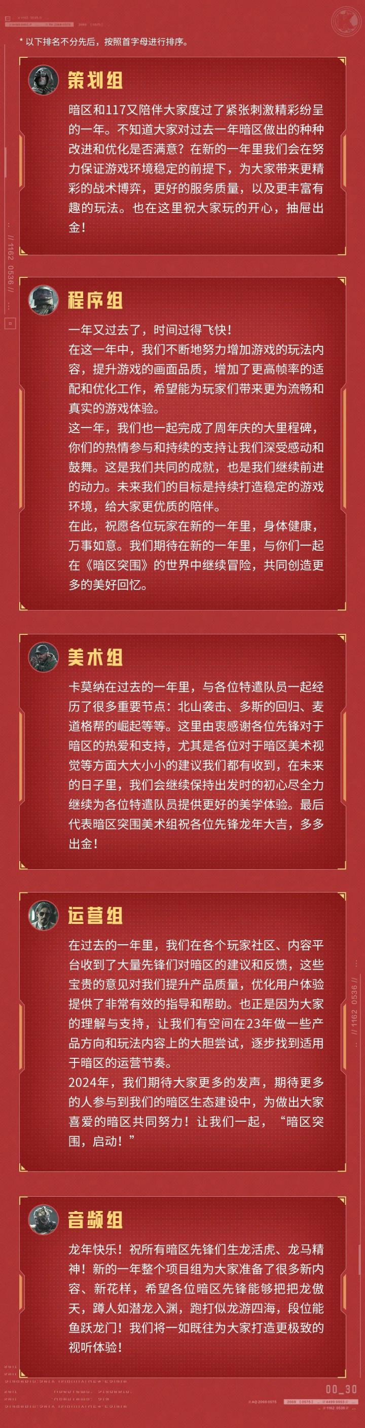 各位先锋,新年好!过去的一年有太多时刻可以回忆,但在此,千言万语都汇集为一句感谢,感谢过去的一年先锋们对《暗区突围》的关注与支持,是你们让暗区充满活力和朝气。我们收集了《暗区突围》项目组各个岗位代表的祝福,请查收~ 大家如果有想要跟项目组各个岗位同学说的话,请敲在评论区,有机会被对应岗位同学直接翻牌!最后,在此祝大家龙年大吉,心想事成!