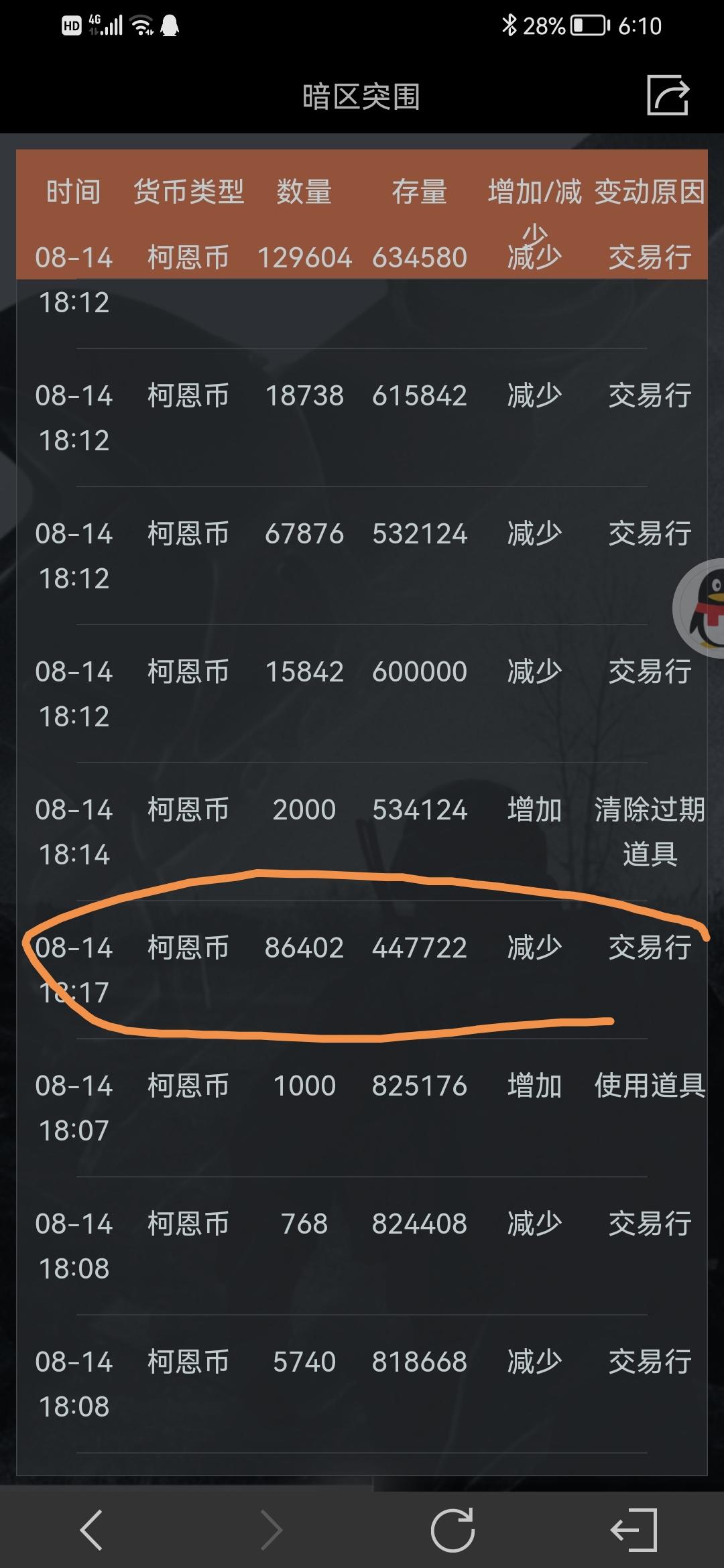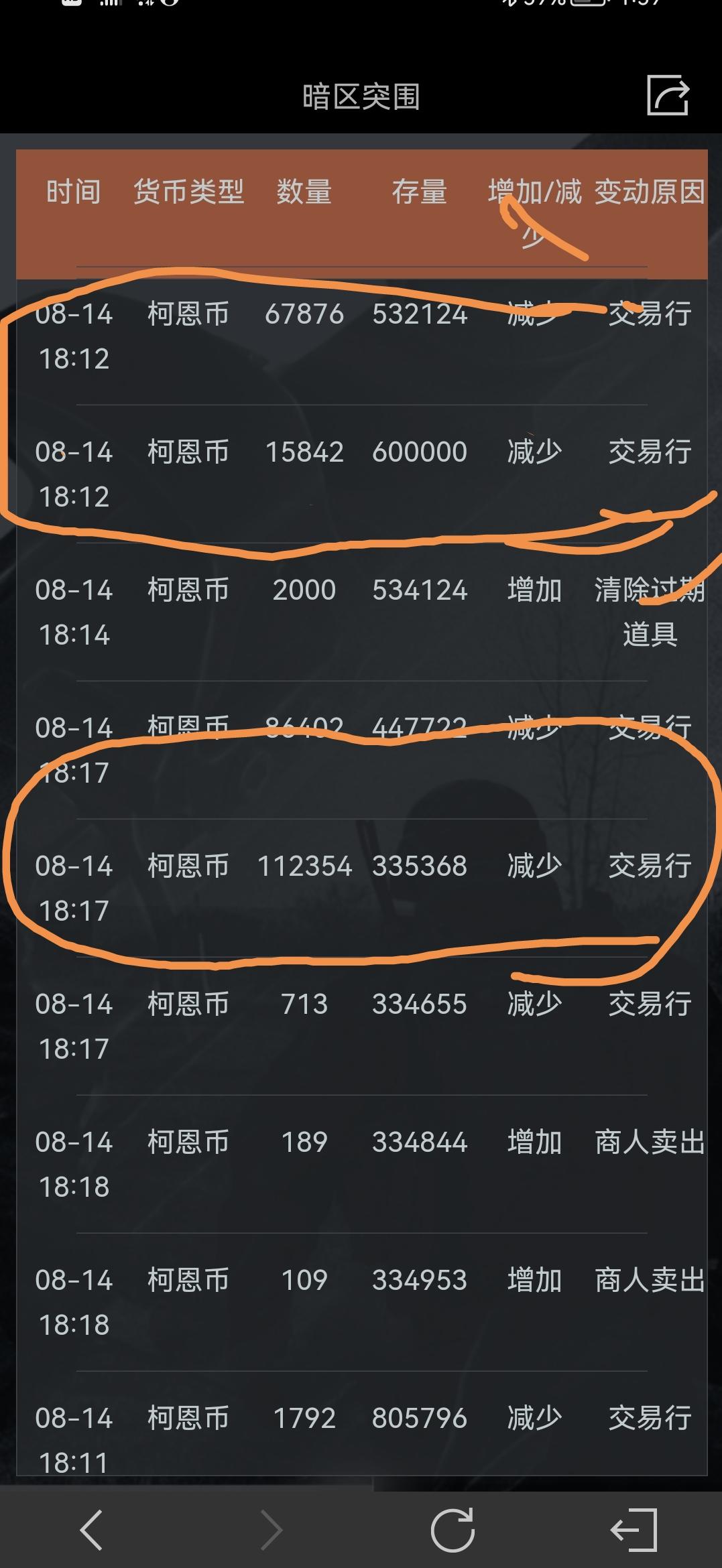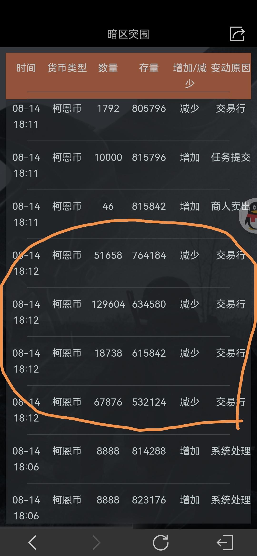 当时整理背包 还有八十万科恩币 一键整理背包后就少到了六十 后来又试了一下 又少了二十万 查看货币流水莫名其妙多出来几个过十万的记录 然后去交易里看 并没有这几个消费 问客服客服也是一种随意应付的样子 而且货币流水直停留在一天 其他天的都不显示