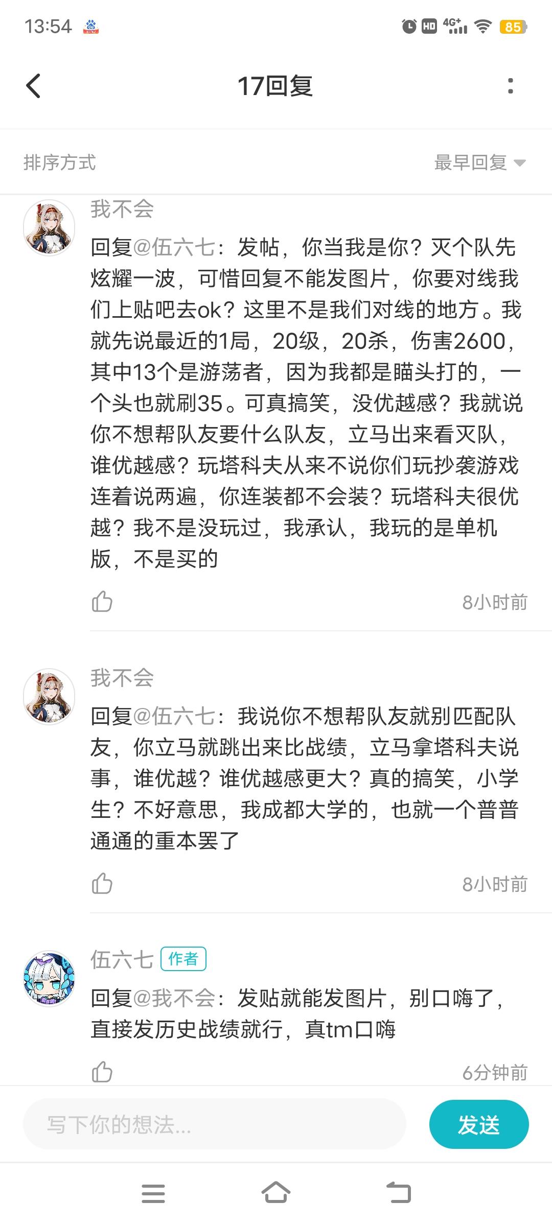 自己说的话自己都不认了,说我炫耀,是你说我不敢一打四,我就发帖证明了自己,现在又说自己是成都重本,把证据发出来好吧,我自己成绩很不好,我也从来没装作自己成绩很好,证据又给不出,又要口嗨,其他的可以装,学问是装不出来的,玩个单机盗版也能说出口,支持正版是玩家最基本的素质吧,就你这素质我就不相信,其他人说话还有我都很客气,就你说几句就骂,这素质还成都大学
