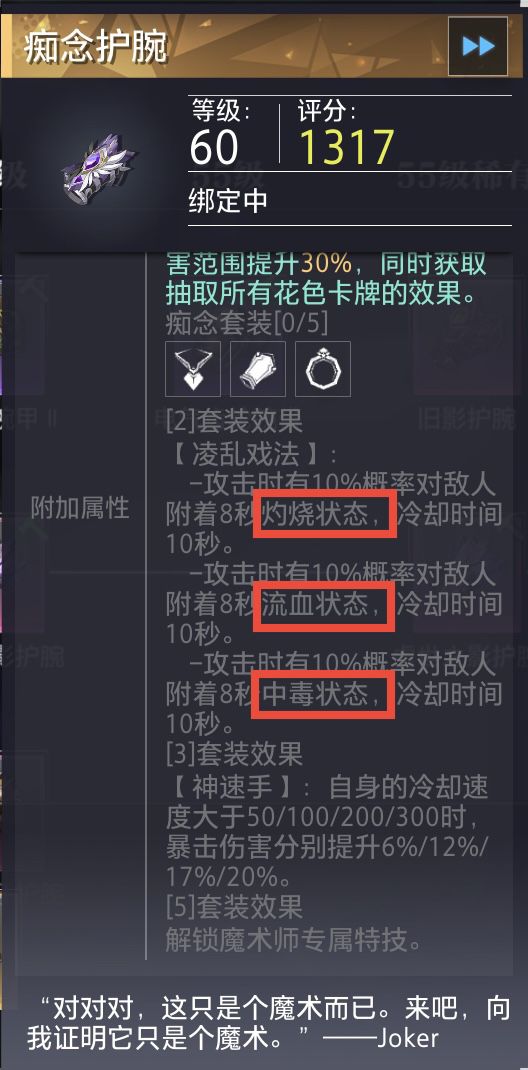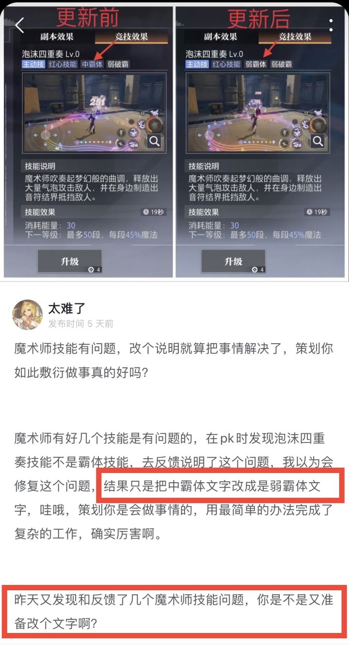 魔术师职业套装问题,伤害丢失问题,策划是不是又准备改下说明来解决问题啊?魔术师套装异常效果,灼烧,流血,中毒,冰冻,变形,眩晕,嘲讽,睡眠,但是boss不受控制,只能在boss身上挂上灼烧,流血,中毒这3种异常效果,其他的异常效果,冰冻,变形,眩晕,嘲讽,睡眠这5种根本无效,所以伤害丢失。有人可能会扣字眼说,不是写了吗,部分异常,那为什么不是所有异常效果都包括进去?比如虚弱,减速等。5