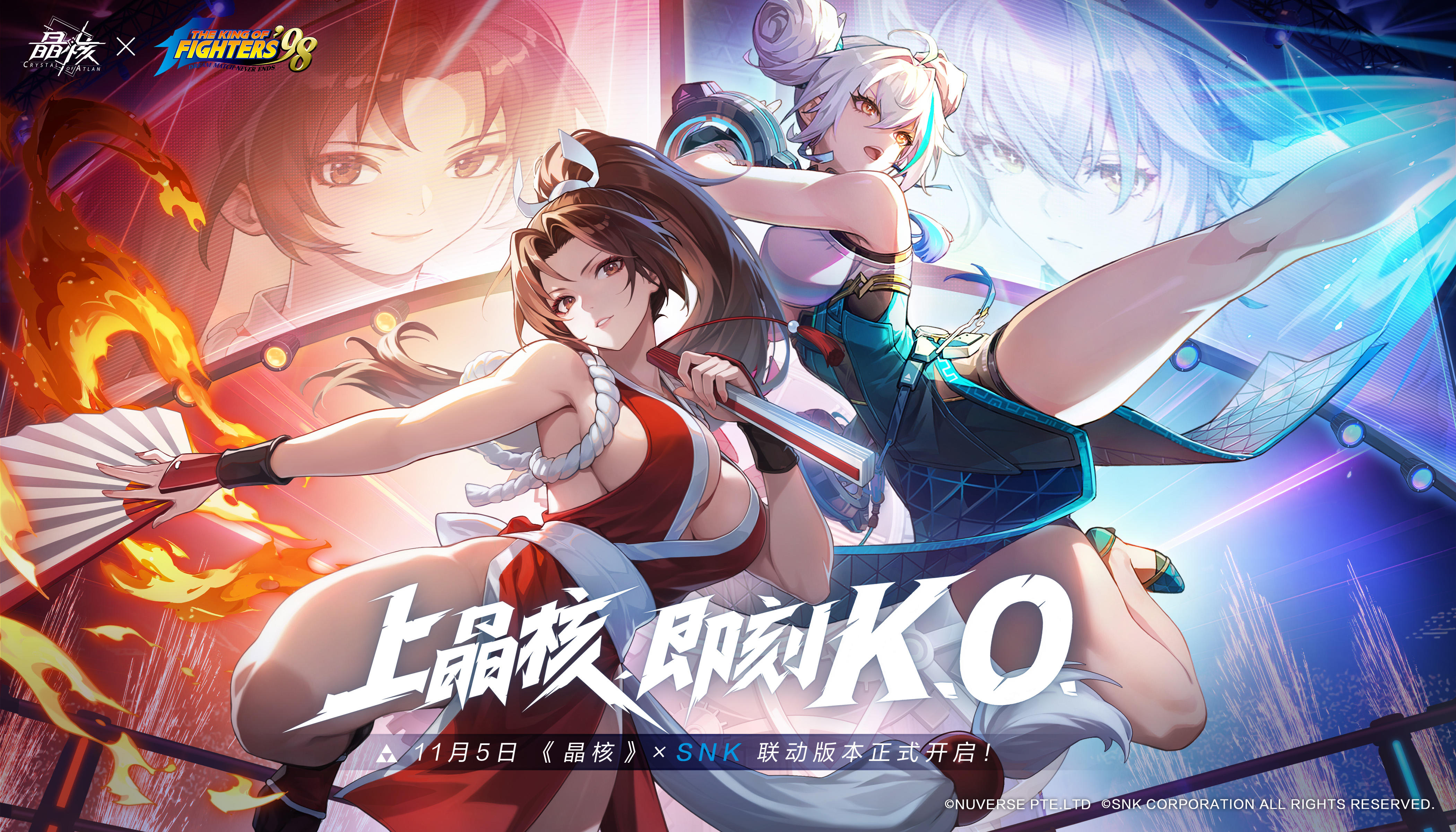 经典格斗传奇与魔导朋克世界的碰撞!高人气角色不知火舞踏破次元前往阿特兰世界,与《晶核》角色云心展开了一场武道对决——《晶核》×SNK联动版本今日正式开启!感谢SNK携手呈现这场跨次元盛宴!欢迎前往《晶核》游戏内体验更多精彩内容~重磅联动福利登场!参与联动活动可获得100个「不知火舞圣物箱」,更有SS级联动称号「与火共舞」、SS级联动光环「绯焰之环」、SS级联动配饰「花蝶扇」、联动专属头像框