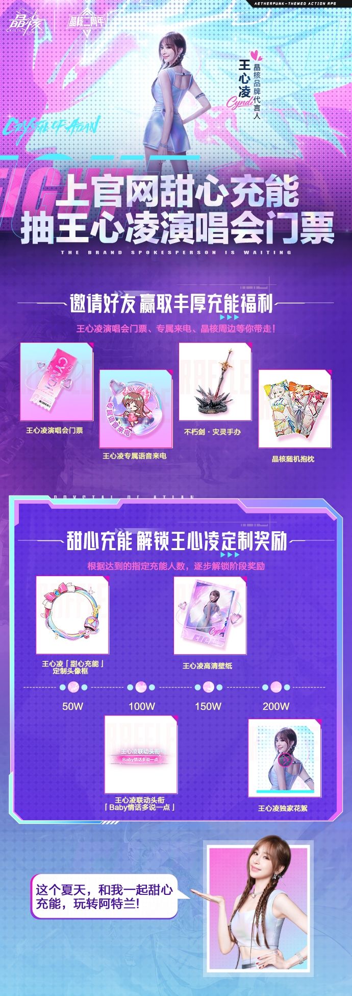暴打无限,甜心充能!品牌代言人Cyndi王心凌甜心充能活动火热开启中~邀请好友即有机会获得王心凌演唱会门票、亲笔签名照、专属语音来电等惊喜奖励!每一次充能都是在为甜蜜惊喜蓄力,当充能进度达到一定值后还可解锁王心凌高清壁纸、独家花絮视频~即刻前往《晶核》官网参与活动,王心凌亲笔签名照及演唱会门票等你来拿>>>https://coa.nvsgames.cn/