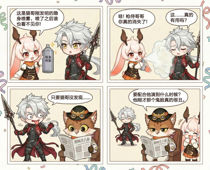 冒险者们,愚人节快乐!期待了一年的整蛊节日终于来啦!小兔和猫哥已经迫不及待挑一个小可爱下手啦,就先拿刚刚登场不久的枪侍来当试验品吧~冒险者们想不想体验猫哥的创意——「隐身喷雾」~欢迎在评论区踊跃报名!