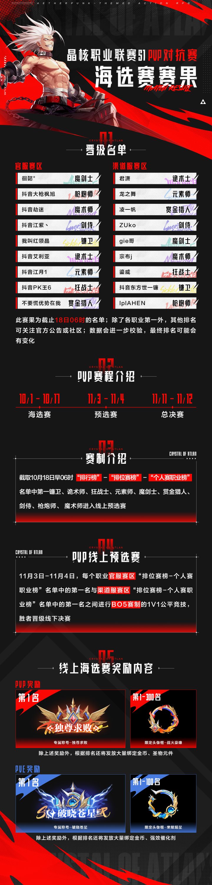 晶核职业联赛S1海选赛阶段目前已经全部结束,十八位最强PVP职业冒险者已经决出,他们将于11月3-4日 18:00,在线上预选赛一决高下,决出最强的九名职业最强冒险者,欢迎前往各大平台官方直播间观看!下面为大家介绍下线上预选赛和线下总决赛的基本信息。线上预选赛比赛时间为11月3日-11月4日,线下总决赛时间为11月11日-11月12日,预选赛和总决赛之间为各位选手预留了一周的准备时间,选手们可以