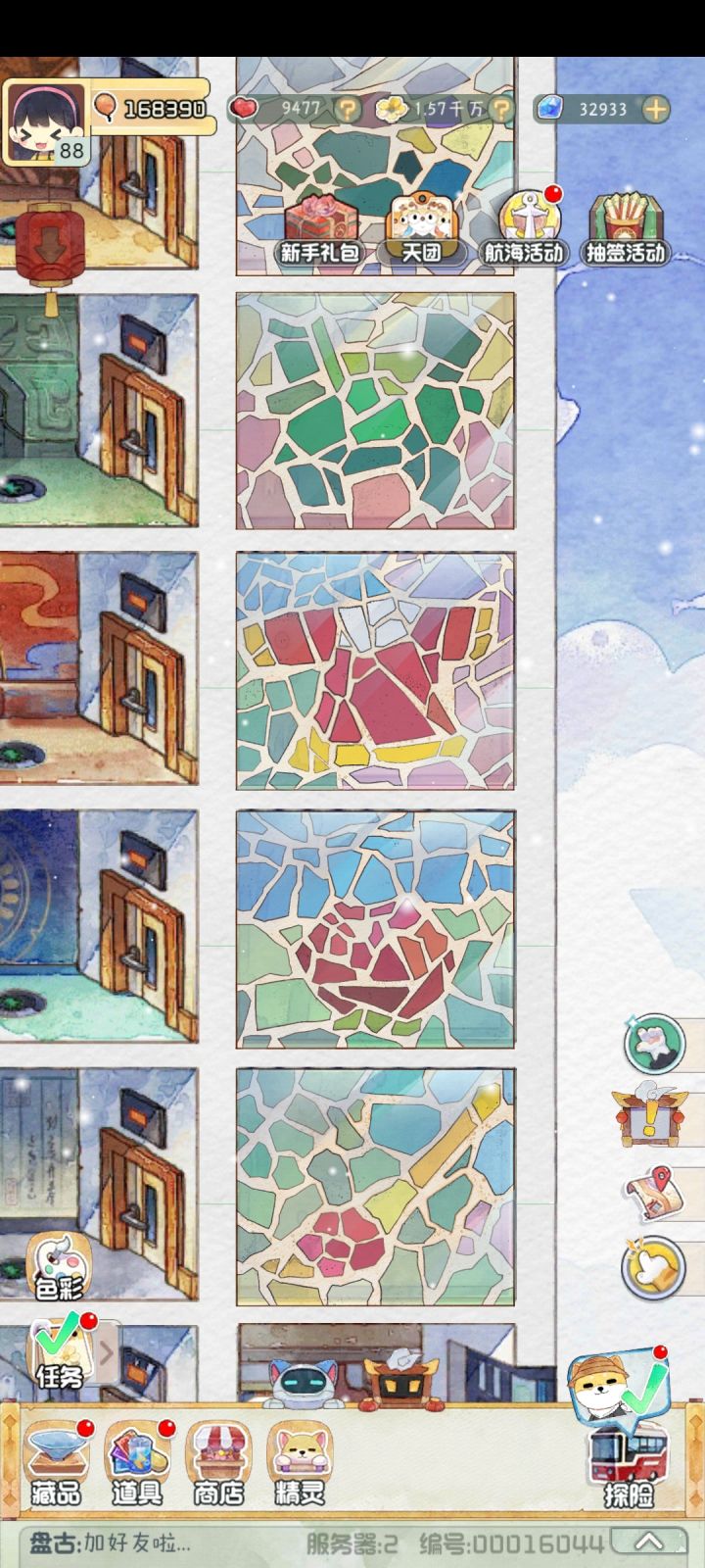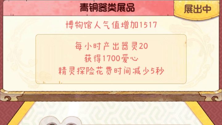 4.28在游戏中,许多不同文物的组合会为我们提供不同的加成收益。首先,天地文物除了提供必备的器灵,人气值,爱心之外,还具有特殊的单独属性。此处简称为其特性。目前已知有:十二兽首/蓬莱玉石仙台/鎏金铁芯铜龙/执念之刃/蝴蝶玉簪花瓶/马踏飞燕/花碟纹云肩/九龙凤冠/神秘钥匙:精灵探险花费时间减5s法门寺金衣/西汉素纱襌衣/纳纱天鹿图卷/缂丝瑶池吉庆图:精灵探险获得的花朵加100供春紫砂壶/