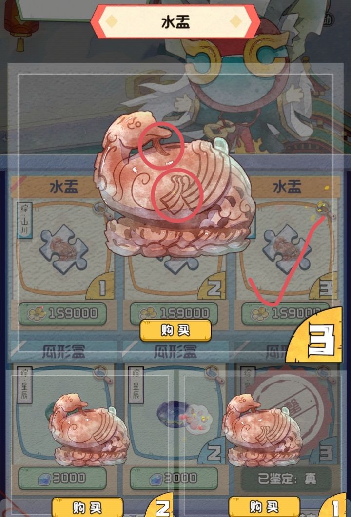 本期符合旧有原则水盂:真品翅根还有个小翅图案,下巴上那一撮东西延展到背上而不是断开。起初我以为那是舌头,但后来看说这是天鸡。瓜形盒:真品为绿皮黄瓤。#攻略#游戏攻略#新手攻略