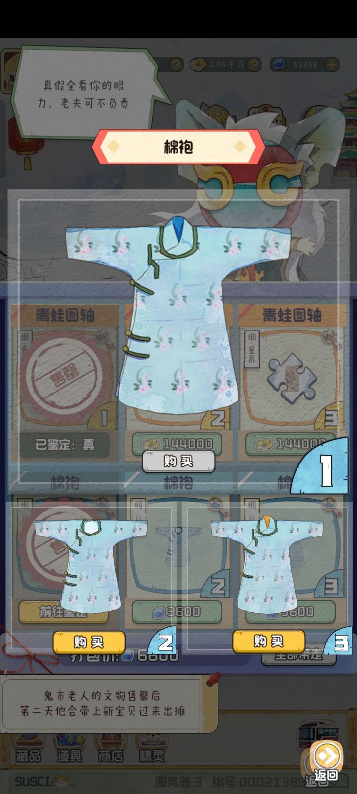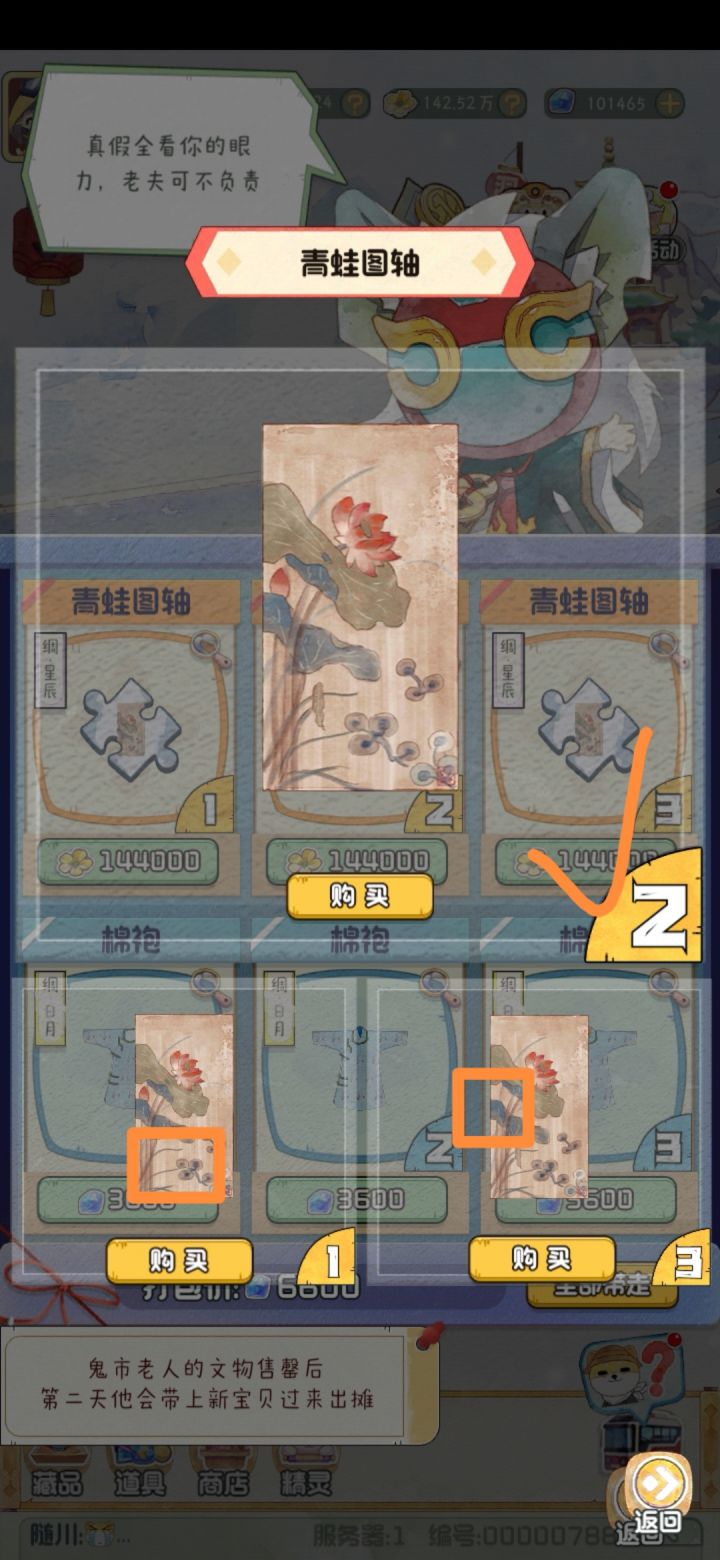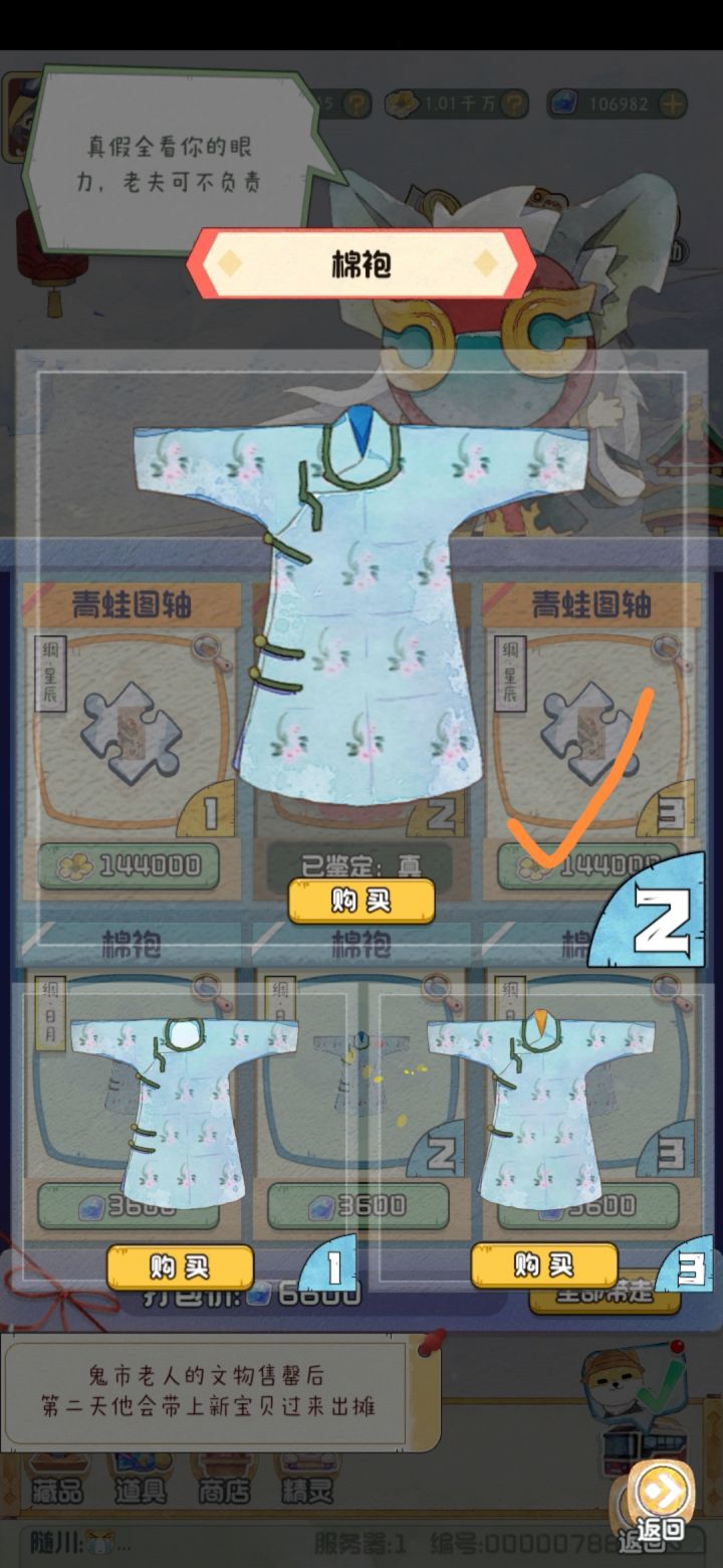 青蛙图轴:真品为左侧有个花苞的,且图中心偏左下有一片下垂的叶子的棉袍:真品是那个领子里面是蓝色的。但是其实也是找不同。真品左侧下方有两个扣子,且有衣领而不是像左下图中根本无领。#攻略#游戏攻略#新手攻略