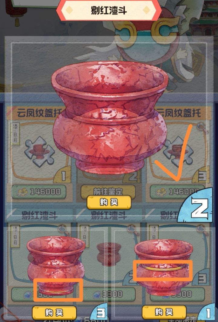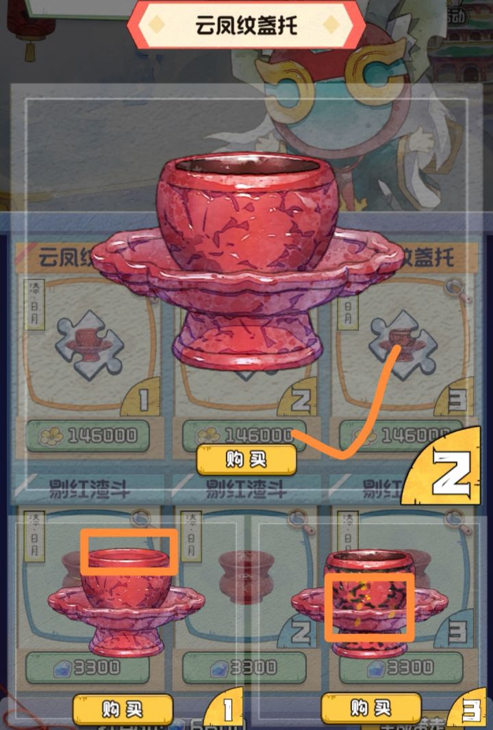 云凤纹盏托:真品为花纹不是深黑色的,且盏体内壁可以从盏口看见是深黑色的。剔红渣斗:真品为斗身和斗底都没有金边的#攻略#游戏攻略#新手攻略