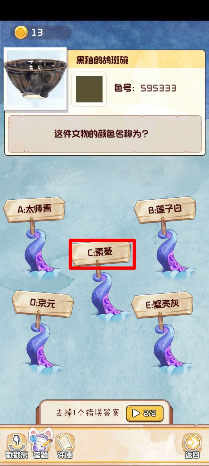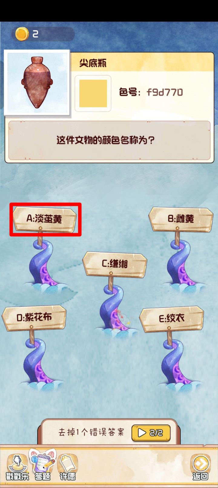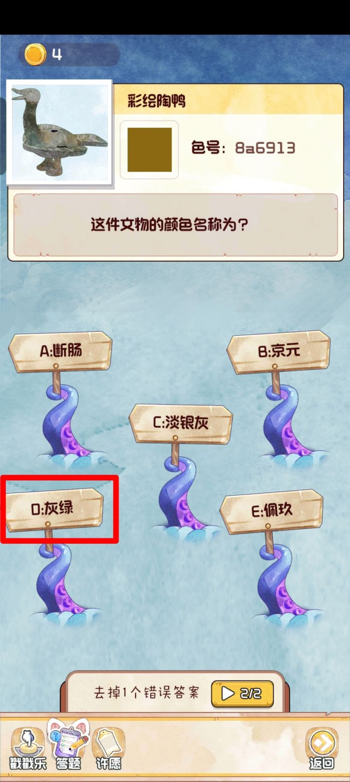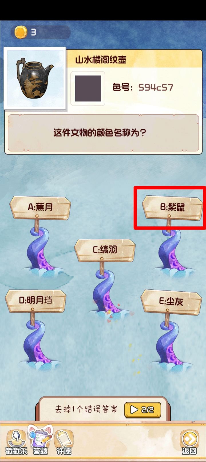 为什么隔两天再答题因为把航海币拿去戳戳乐抽奖了于是我抽完了第一轮直到最后一个才抽出来文物现在全身心投入答题----------彩绘陶鸭 8a6913 答案:灰绿尖底瓶 f9d770 答案:淡茧黄山水楼阁纹壶 594c57 答案:紫鼠----------超过十次答题我再整理成帖子吧现在雀食没有动力