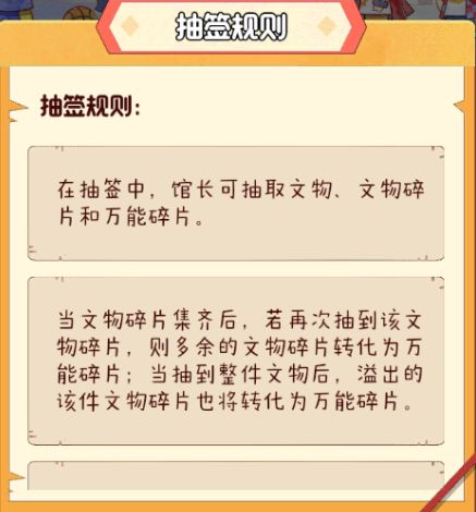馆长完成新手引导后,即可解锁“国之重宝”抽签活动,活动入口在主界面右上角。 在活动界面中,馆长每天可进行一次免费抽签。 活动共30件文物可抽取,稀有度均为天地和日月。在活动界面的兑换图鉴中可以查看活动文物及碎片收集情况。 万能碎片也可以替代本次活动文物的文物碎片,点击文物下方的“兑换”键,即可用万能碎片兑换该文物的碎片,并前往修复。#攻略