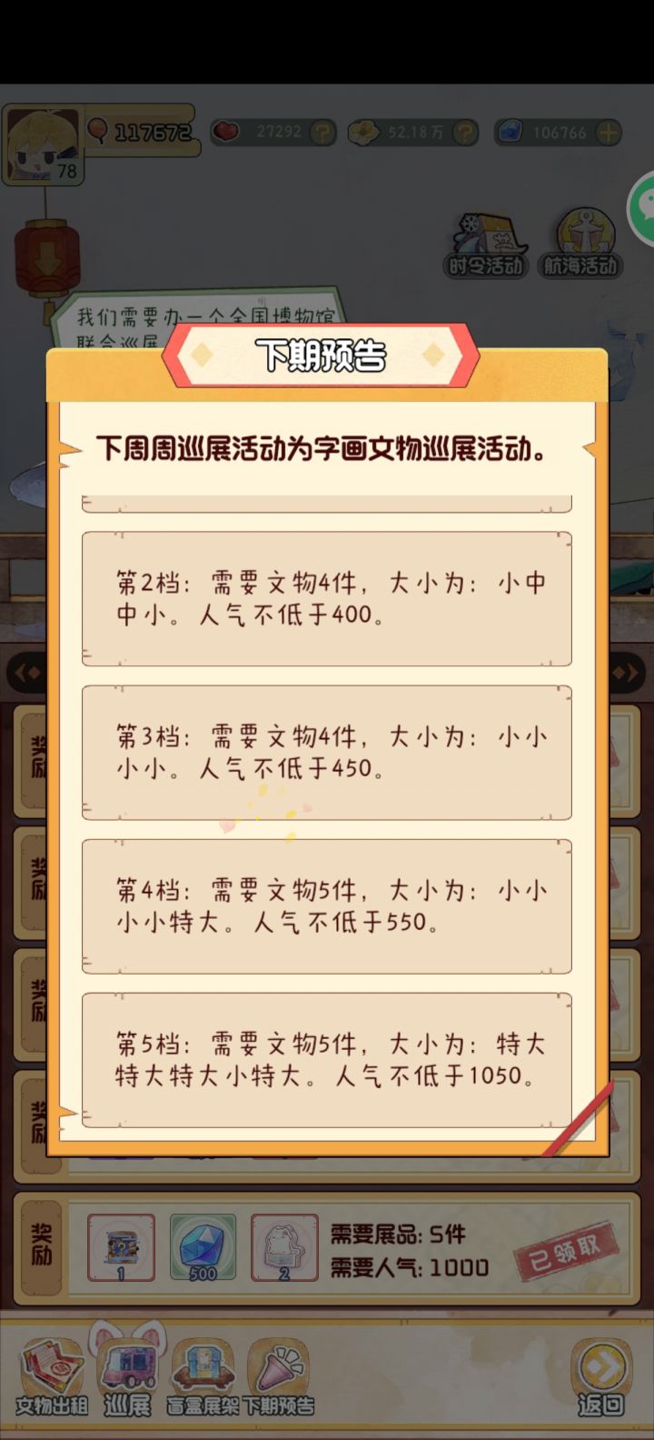 这个是不是搞错了?玩到现在人气也是近12万了,特大字画就一个,大的字画有一些但下周活动里一个都没有哇?全是特大,是不是搞错了……