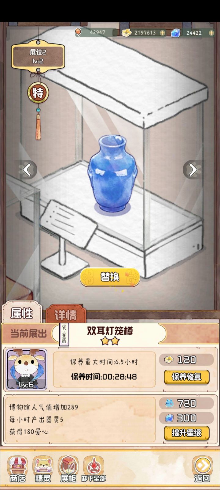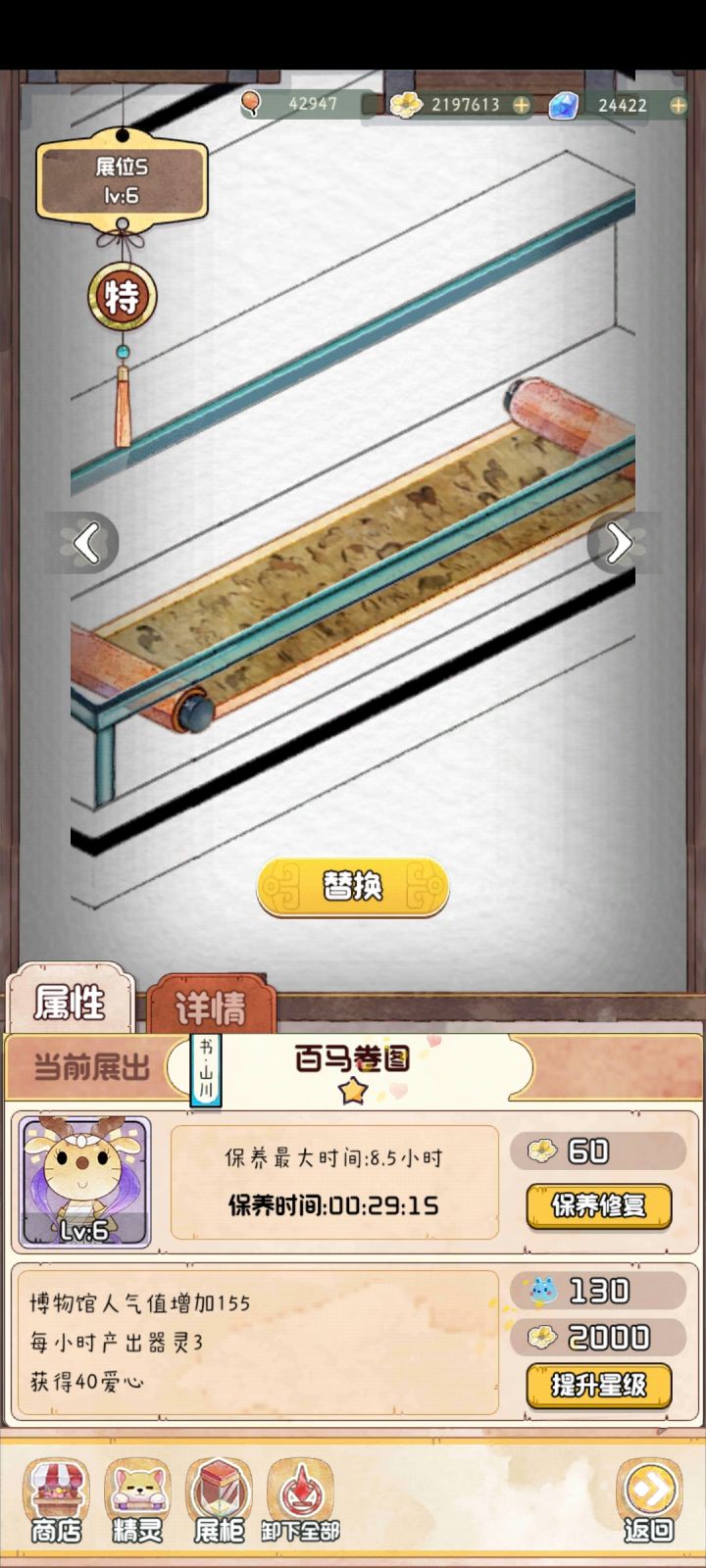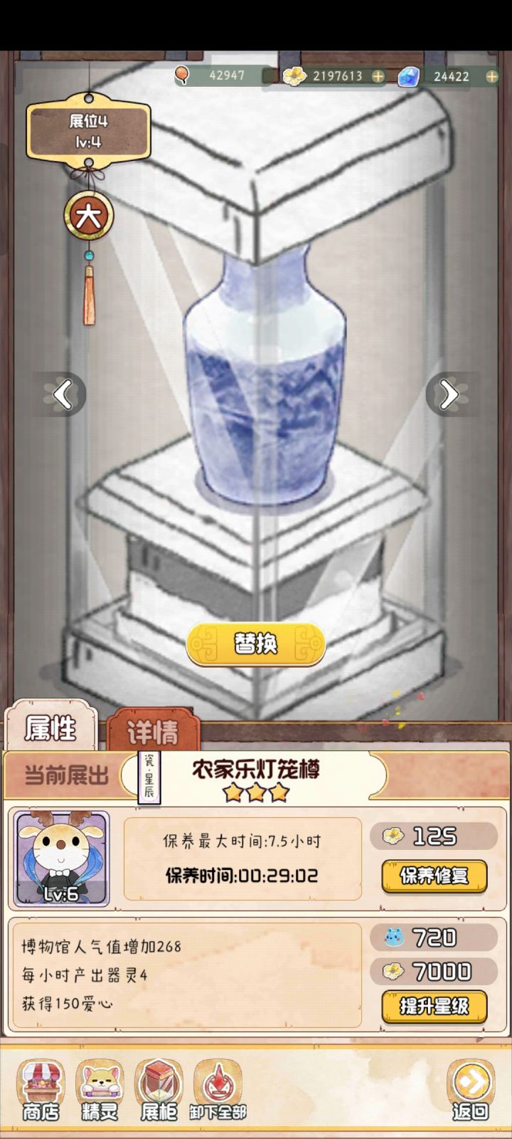 如图,每次上线时间间隔比较长的时候,博物馆理论上应该是一片废墟,到处头顶两把交叉小扫帚的文物,但是…… 对,就是但是,在我有展厅已经升级到9.0小时的时间已经如此的情况下,时间8.5、7.5,甚至最少的只有6.5的展厅文物,一般都是显示还有半小时以内时间,这着实让人觉得有点遗惑啊…… 不知道器灵是怎么算的,如果这样的话,把所有展柜都只升级到末尾是0.5的保养最大时间是不是就可以一直收器灵? 这个都