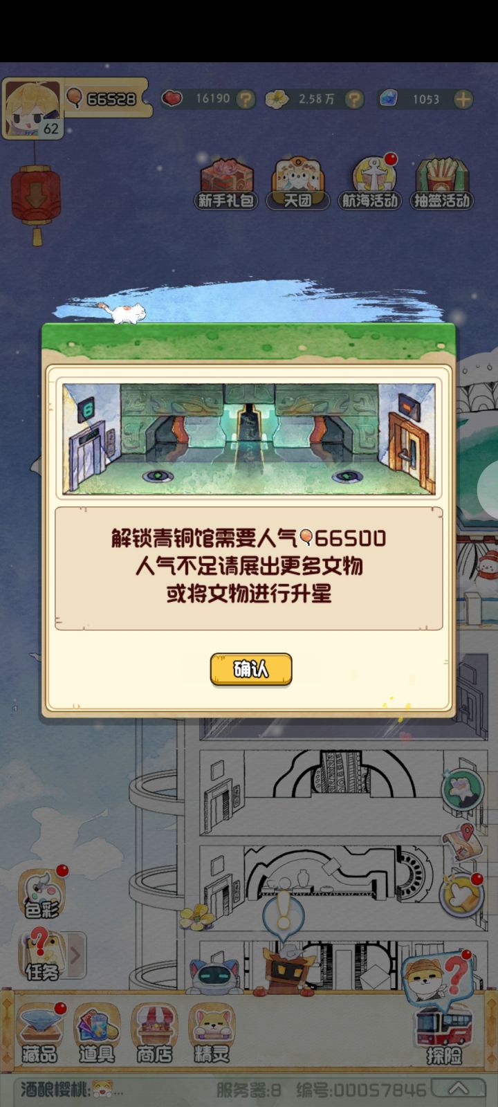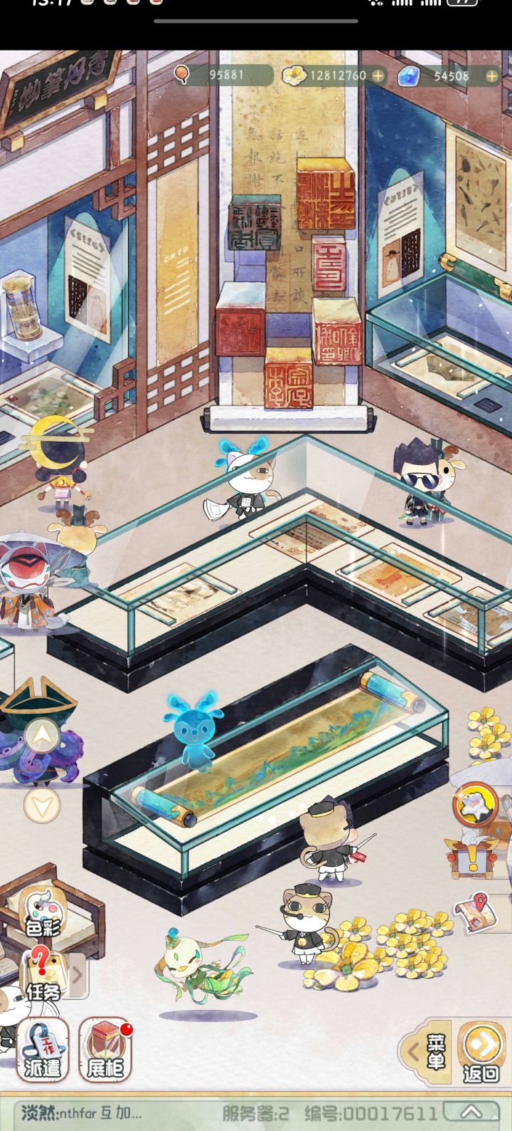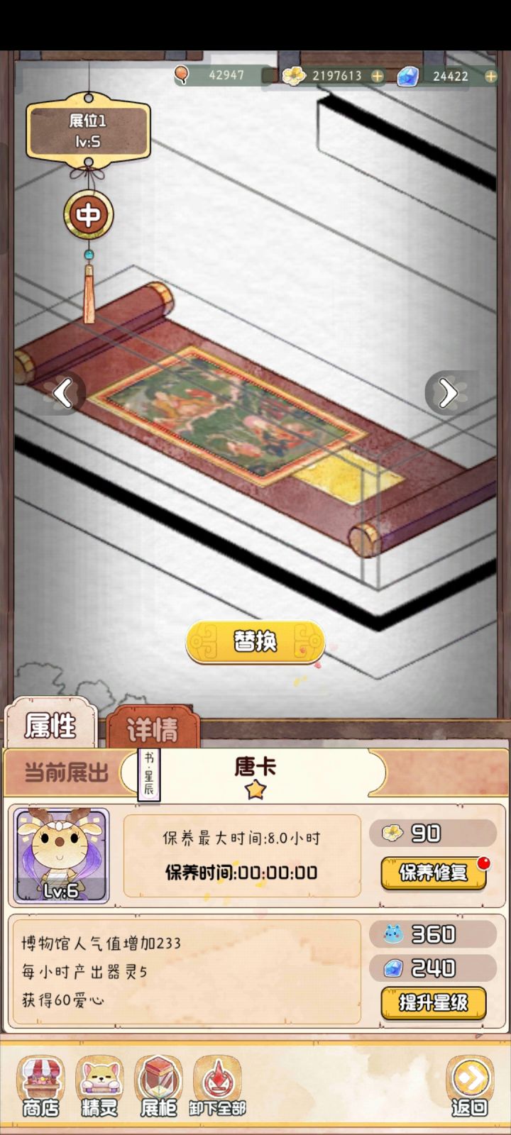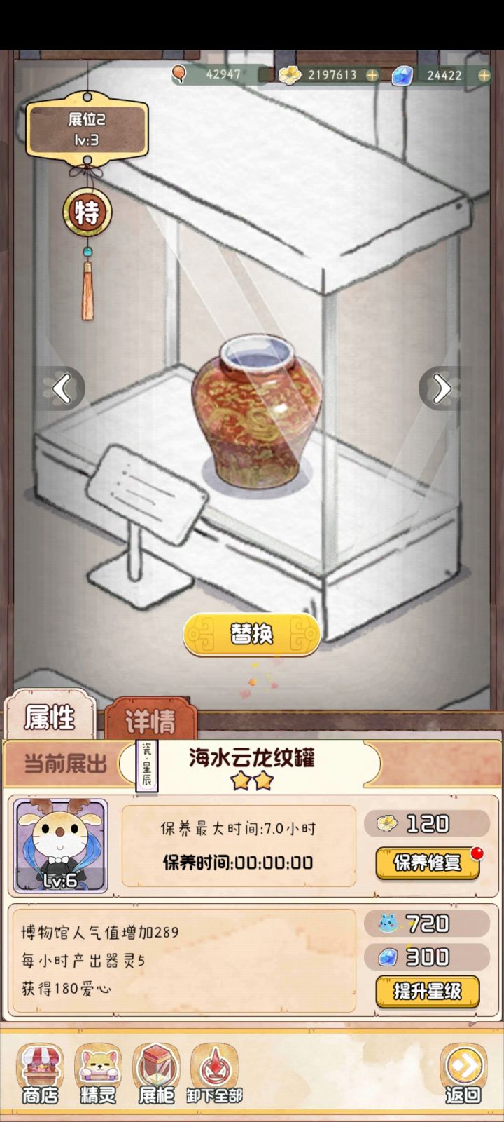 如图,每次上线时间间隔比较长的时候,博物馆理论上应该是一片废墟,到处头顶两把交叉小扫帚的文物,但是…… 对,就是但是,在我有展厅已经升级到9.0小时的时间已经如此的情况下,时间8.5、7.5,甚至最少的只有6.5的展厅文物,一般都是显示还有半小时以内时间,这着实让人觉得有点遗惑啊…… 不知道器灵是怎么算的,如果这样的话,把所有展柜都只升级到末尾是0.5的保养最大时间是不是就可以一直收器灵? 这个都
