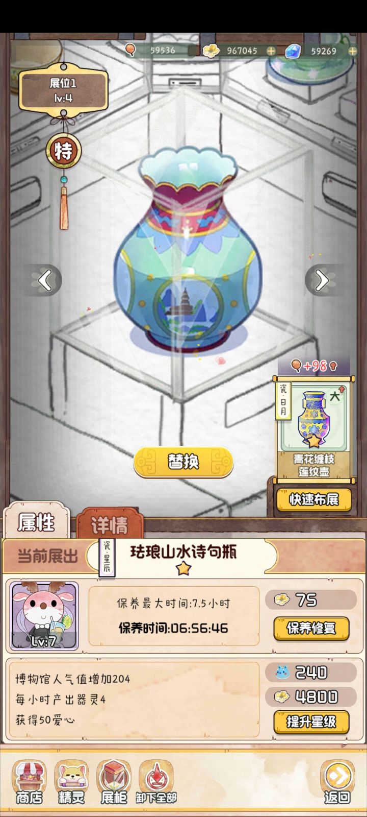 在外面展柜没显示有更好的替代品可以替换,点进去才发现还有更高级别的展品。。。。书画馆也是这样的,开始我以为是上色了挡住了那个可以替换的标识,没想到其他的地方也这样,这是bug吗?