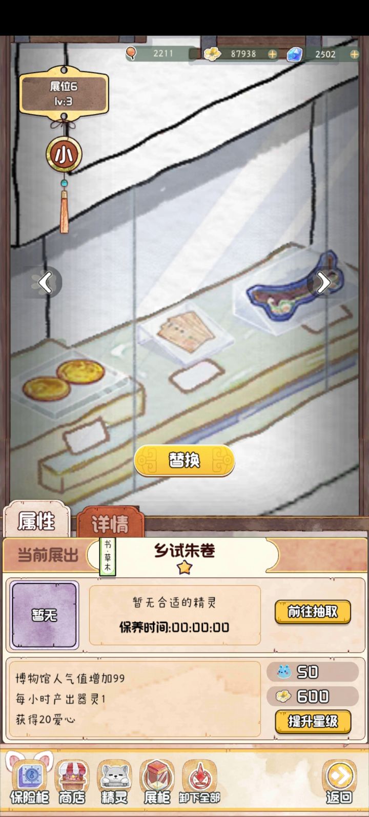 如下图,随着文物等级升高,修复时长越来越长,下面这个就15h呢!把三次广告看满也才减半个小时,不过杯水车薪罢了,那谁还愿意去看那三次广告呀?制作方肯定也是希望玩家多看广告,但又怕广告次数设置太多会惹玩家烦的吧?那就增加看广告能减少的修复时长呀。比如说,看一次广告能减少1/3时长之类的。以15h为例,看完第一个广告后减少15h的1/3,那就还剩下10h修复完。看完第二个广告再减少剩余的10h的1