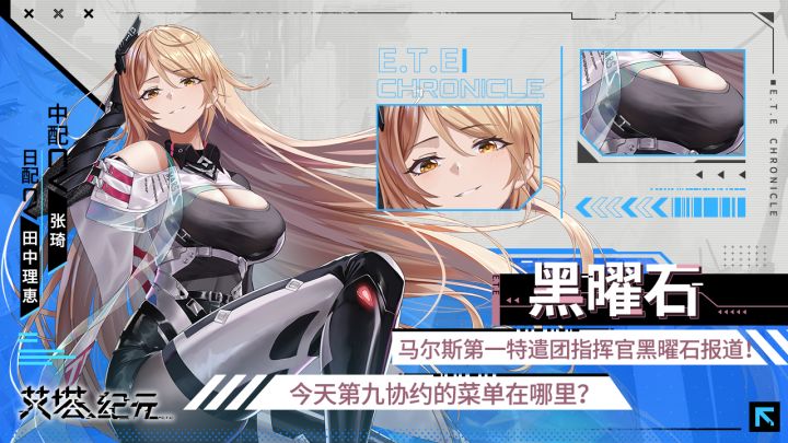 『马尔斯第一特遣团指挥官黑曜石报道!今天第九协约的菜单在哪里?』〚同步者数据〛 [名称] 黑曜石 [本名] 奥莉维亚·凯撒 [身高] 170 [外表年龄/真实年龄] 18/26 [喜好] 四处度假、去第九协约蹭饭 [中配CV] 张琦 [日配CV] 田中理惠 〚同步者简介〛马尔斯第一特遣团军团长,是马尔斯最优秀的前线指挥官之一,无论是个人实力还是指挥能力都是同盟顶尖水平,