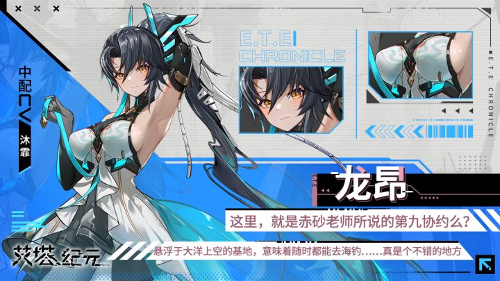 『这里,就是赤砂老师所说的第九协约么?悬浮于大洋上空的基地,意味着随时都能去海钓……真是个不错的地方。』〚同步者数据〛 [名称] 龙昂 [本名] 诸葛缘修 [身高] 160 [外表年龄/真实年龄] 17/18 [喜好] 钓鱼 [中配CV] 沐霏 〚同步者简介〛龙昂出生于九域联盟沿海的一个传统世家,是家主唯一的女儿。她有着极高的艾塔驾驶天赋和战斗直觉,曾经受到赤砂的倾力培养
