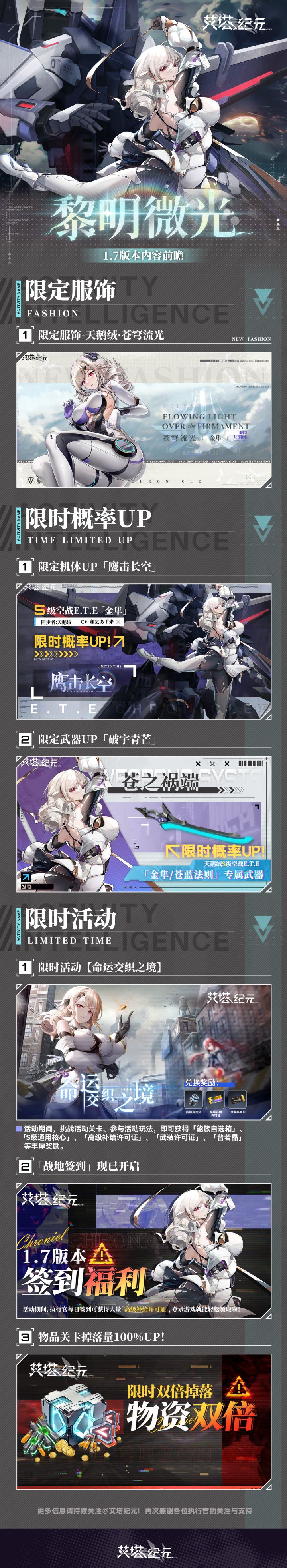 亲爱的执行官: 1.7版本「黎明微光」将于9月26日更新维护后上线!新的S级艾塔「金隼·苍蓝法则」上线,可通过限时机体补给活动【鹰击长空】获得。有着独特战场压制能力的艾塔,更进一步增加了强力的能量反制能力,使其在各类高烈度战斗中均将发挥出极为关键的作用。 专属于天鹅绒<金隼·苍蓝法则>的限时服饰「苍穹流光」已开启限时出售,执行官可通过皮肤商城购买获取 此外,参与限时活动【命运交织之夜】、【战