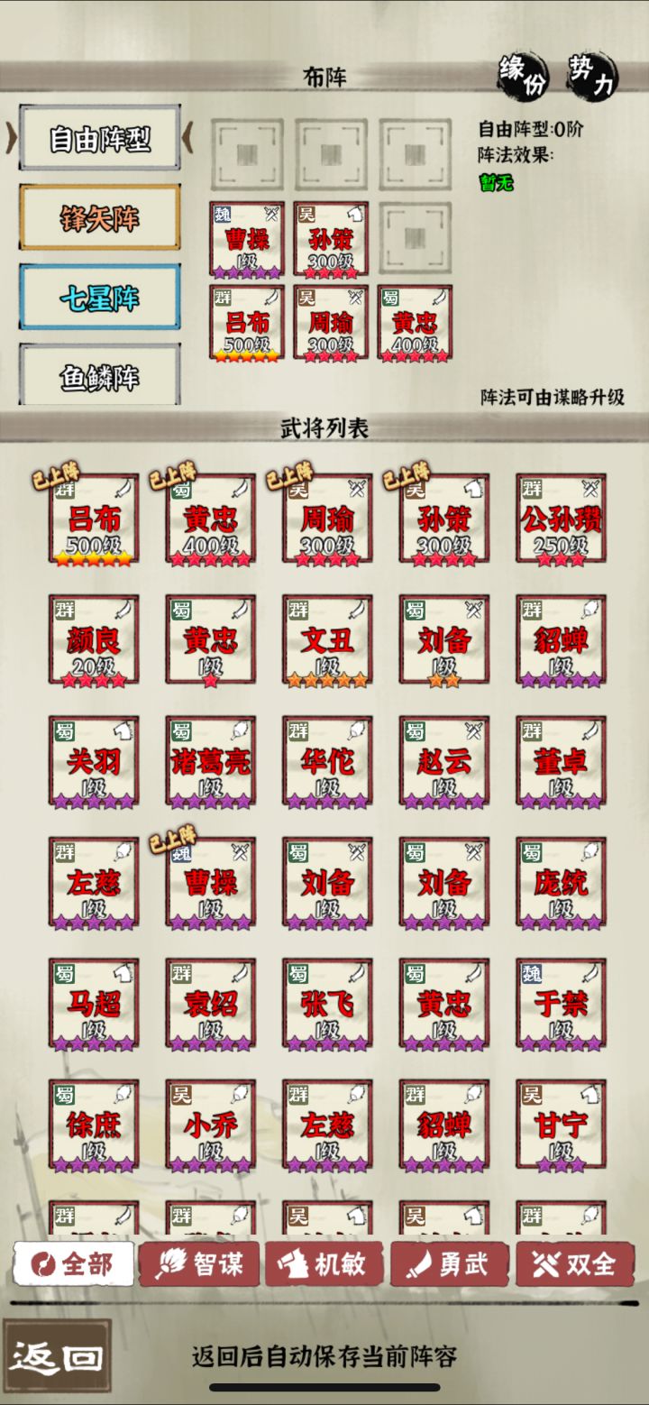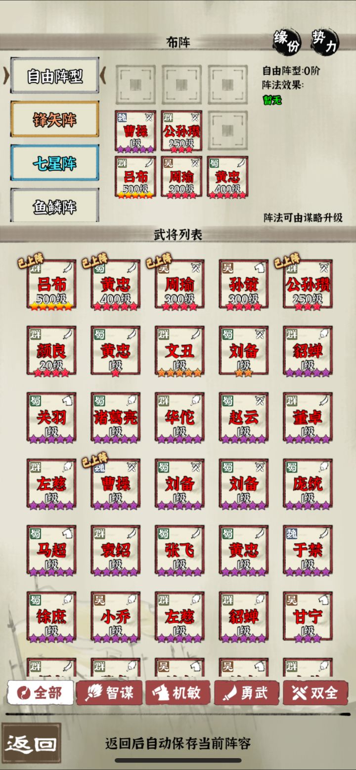 阵容:吕布、张苞、黄忠、公孙赞、乐进神器:公孙及乐进分别带个七杀,吕布无双,其它全部墨攻神兽:(玄鸟)吕布、(大鹏)张苞、(凤凰)黄忠、(龙马)公孙赞、(陆吾)乐进阵形:自由L,7,⊥该配置,直推458一8关,中途不用换将
