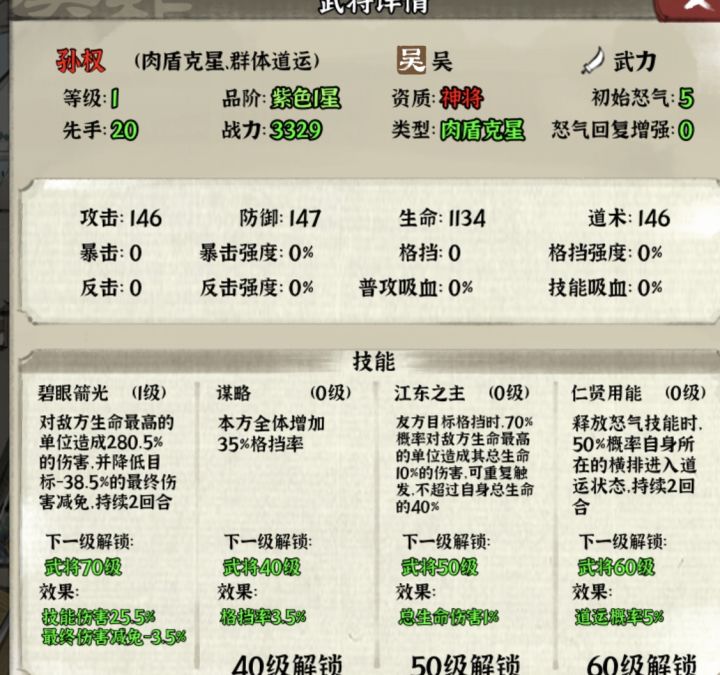 类型:勇武 势力:吴技能介绍:一技能:对最高血量造成伤害,并且降低最终伤害减免(这个效果的武将只有两个人有)。二技能:增加全体格挡率。三技能:友方格挡成功,对最高生命敌人造成最低自身百分之40生命的伤害。四技能:横排进入道运状态(只有两个武将有这个技能)武将分析:孙权最厉害的就是二三技能,二技能增加前排坦度,三技能辅助前排打出更高伤害。一技能因为对最高血量敌人降低减免,做不到指哪打哪