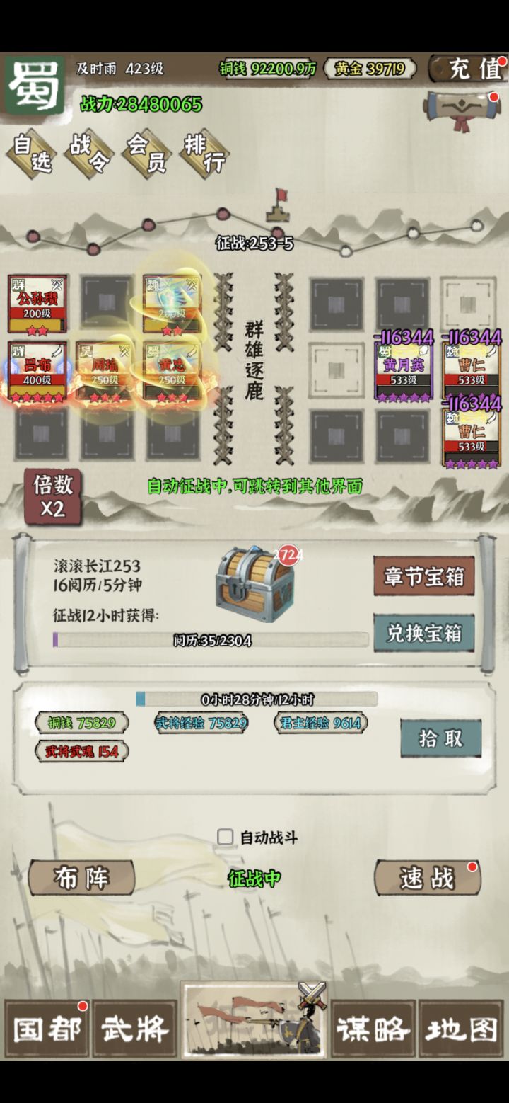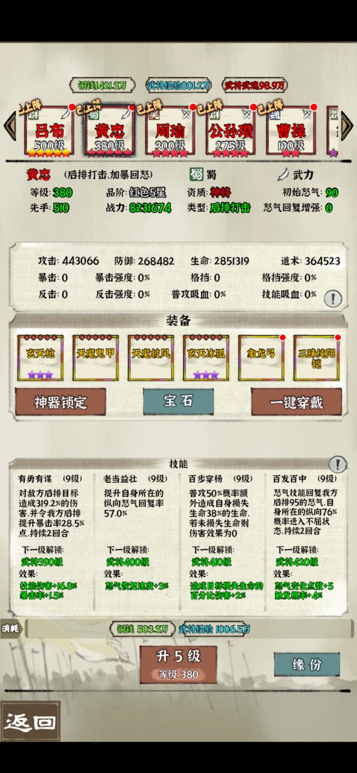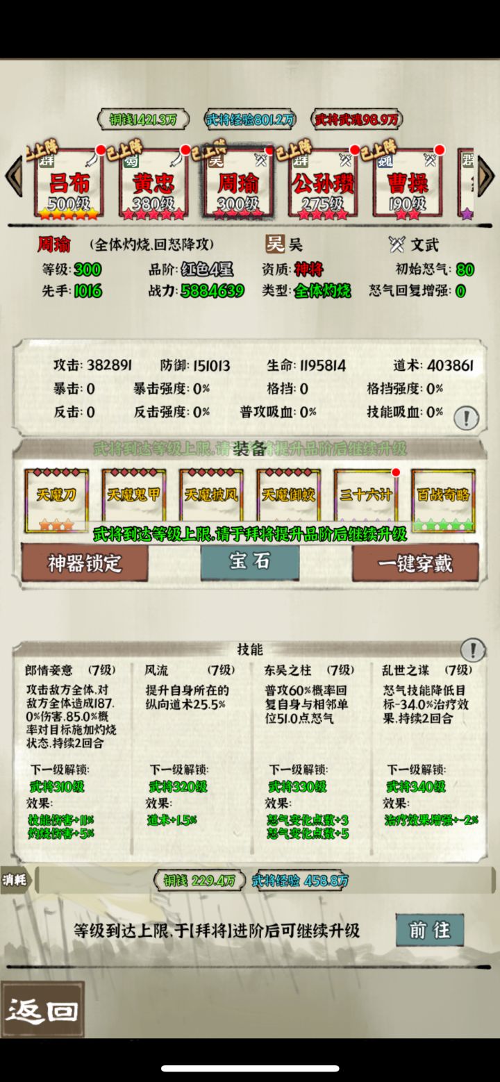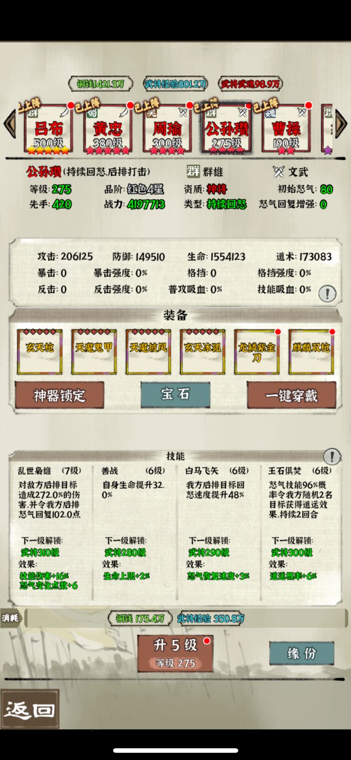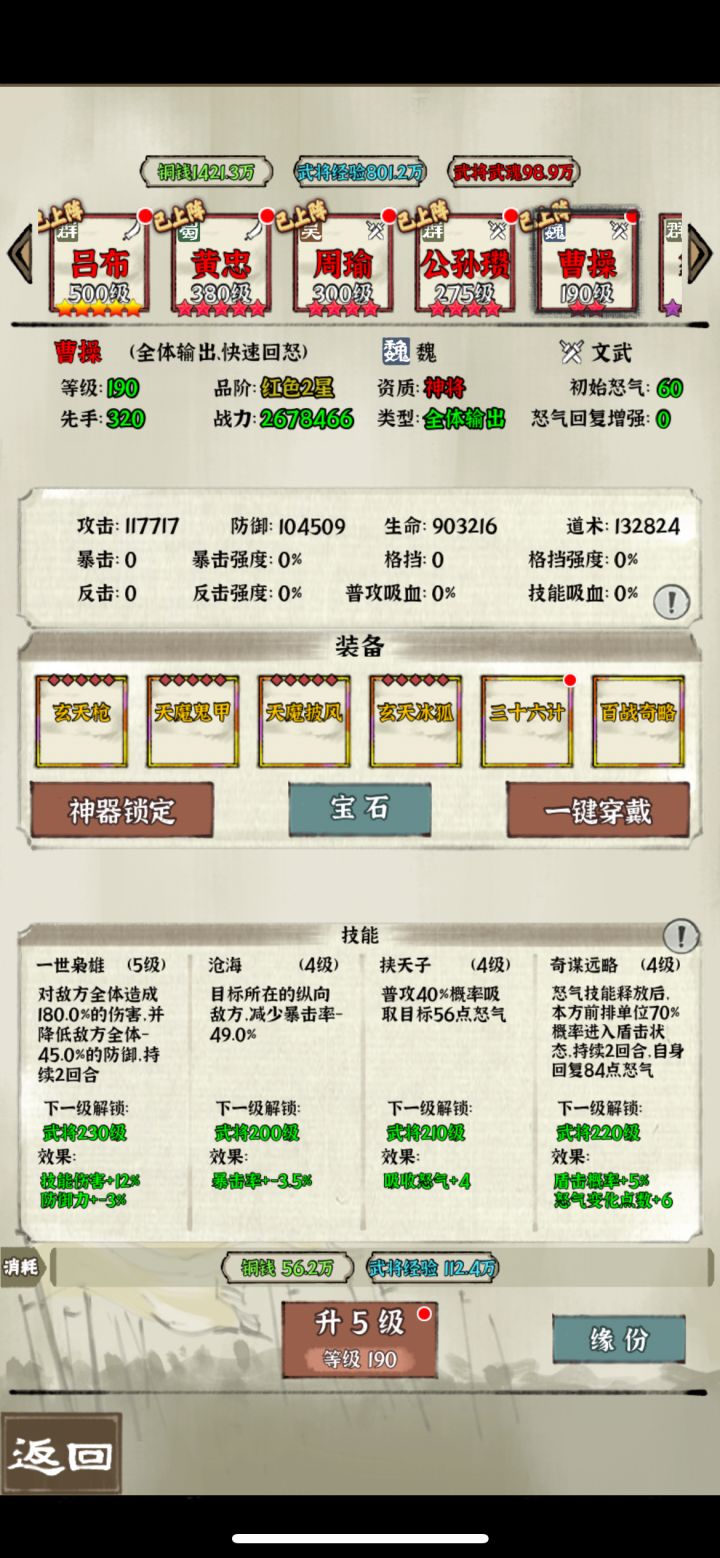分享一些日常的小攻略,仅供大家参考讨论 1.天命和征讨叛军(打董卓)次数可以累计,其中征讨叛军是神器经验的主要获取来源,可以积累起来等战力提升之后再打 2.国战粮草消耗和上阵武将的战力有关,日常捡箱子和采矿的时候最后选一星智谋紫将(我主要用法正或马良,主要考虑科技不用升),选自由阵型不带装备和宝石,这样粮草消耗少一些。 3.吕布阵容的神器主要找墨攻 七杀和碎击(优先墨攻,最好有墨攻方天)。吕
