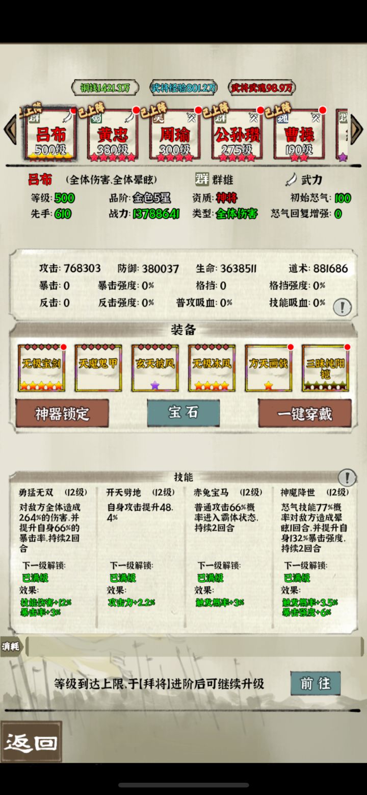 最详细的吕布阵容解析 ——我是ios12区的圆脸怪 看完觉得有用劳烦点个赞。本攻略为的是从根本去理解吕布阵容,让大家不走弯路。会从技能、阵容、神器、等级、阵型、资源利用来分析。一:技能分析:吕布 一技能:增加全体暴击率。 二技能:增加自身攻击。 三技能:没用。 四技能:最低百分之35概率晕眩一回合,增加暴击强度,美升级一次提高百分之3.5。 分析:吕布是阵容的核心,最重要就是四
