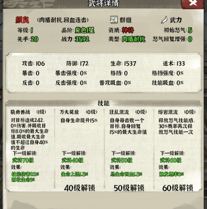类型:勇武 势力:群雄 技能介绍:一技能:单体伤害,造成最低自身血量百分之40伤害并且回血。二技能:能加血量百分比。三技能:杀敌以后回血。四技能:刷新一技能。分析:颜良作为格挡阵前期最肉红将,比孙策厉害太多,而且一技能造成的伤害差不多是真实伤害。而且不难看出颜良只需要一种属性,就是血量!!所以不论科技,还是装备,还是神器,还是宝石都是血量优先!!!神器搭配也是用遗策和舍身。建议: