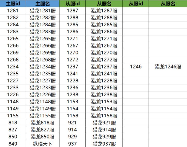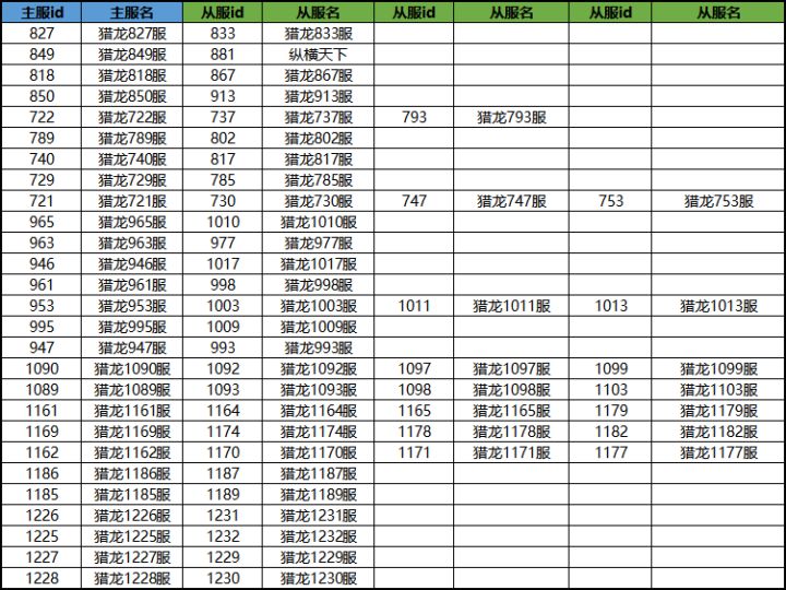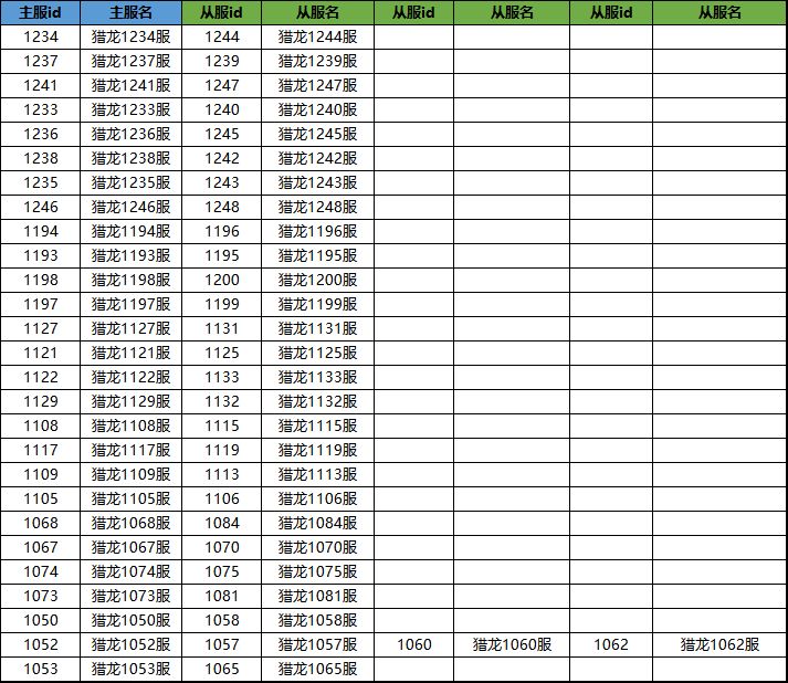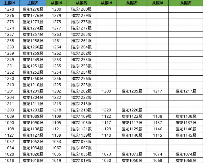 亲爱的各位猎人:游戏合服名单新鲜出炉, 10月12日合服名单如下,猎人们注意查收哦~合服名单温馨提示:1.以上公告内容仅供参考,一切以游戏内实际数据为准。2.公告最终解释权归《狩猎使命》运营团队所有。
