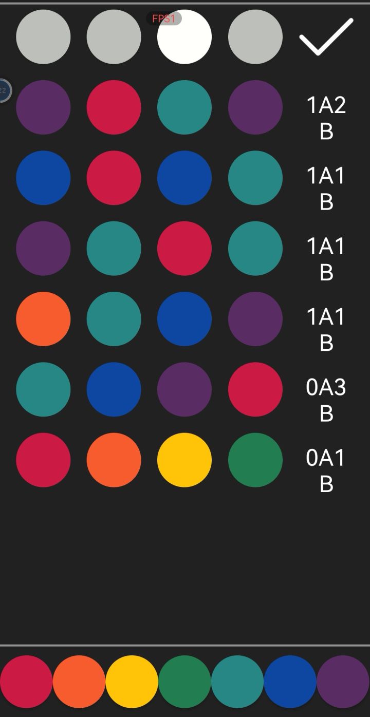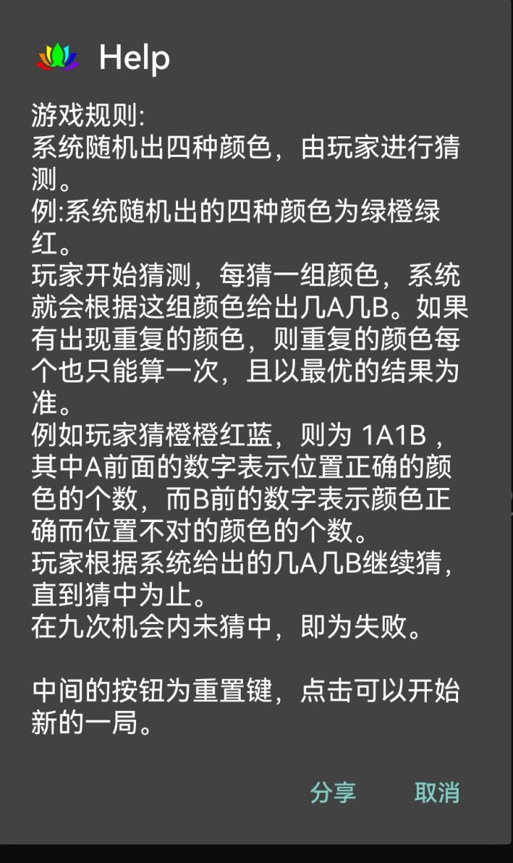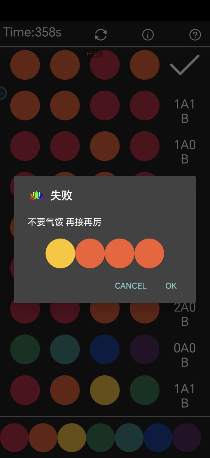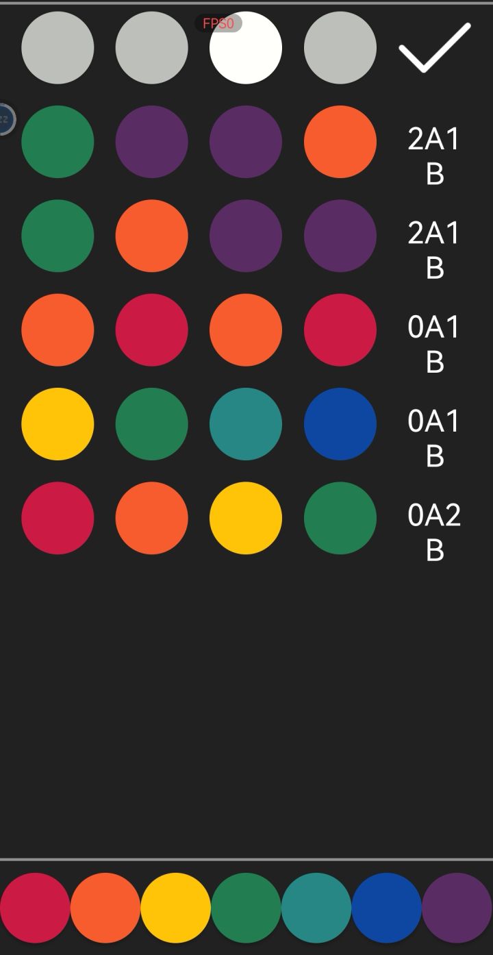 游戏实际显示的AB数量和规则不一样欸第三次试“红红橙橙”出了2A,还以为只有红色和橙色了,结果最后是黄色和橙色。还有第五次试“橙橙橙红”,竟然出了2A1B,和游戏规则完全不一样啊……
