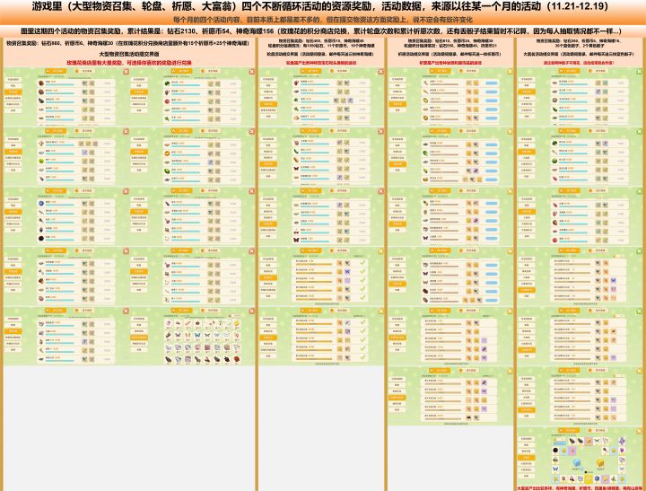 ✨若有过大活动内容改动,帖主将会不定时更新(如果那时我还没弃坑的话) ✨若发现有错,也欢迎在评论区发言提示我! ✨tips:在tap里打开,加载是会比较慢的。下载到手机相册打开,反而加载能快一些。 ✨顺序:大型物资召集活动—轮盘活动—大富翁活动—祈愿活动,每月循环。⭐️每次活动奖励内容,它可能有些许出入,并不是完全一致。#牧场气息 #活动 #物资召集 #攻略