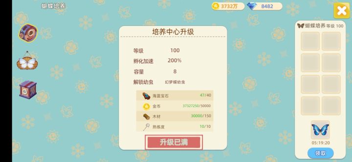 木头都满了,斧子等级后期纯爱肝啊,砍着玩,后期金币也多,加点消耗的地方嘛,100级,有点太容易肝到了可以200级概率20双倍蝴蝶啊,或者加抓到稀有蝴蝶的概率啊之类的后期很无聊唉