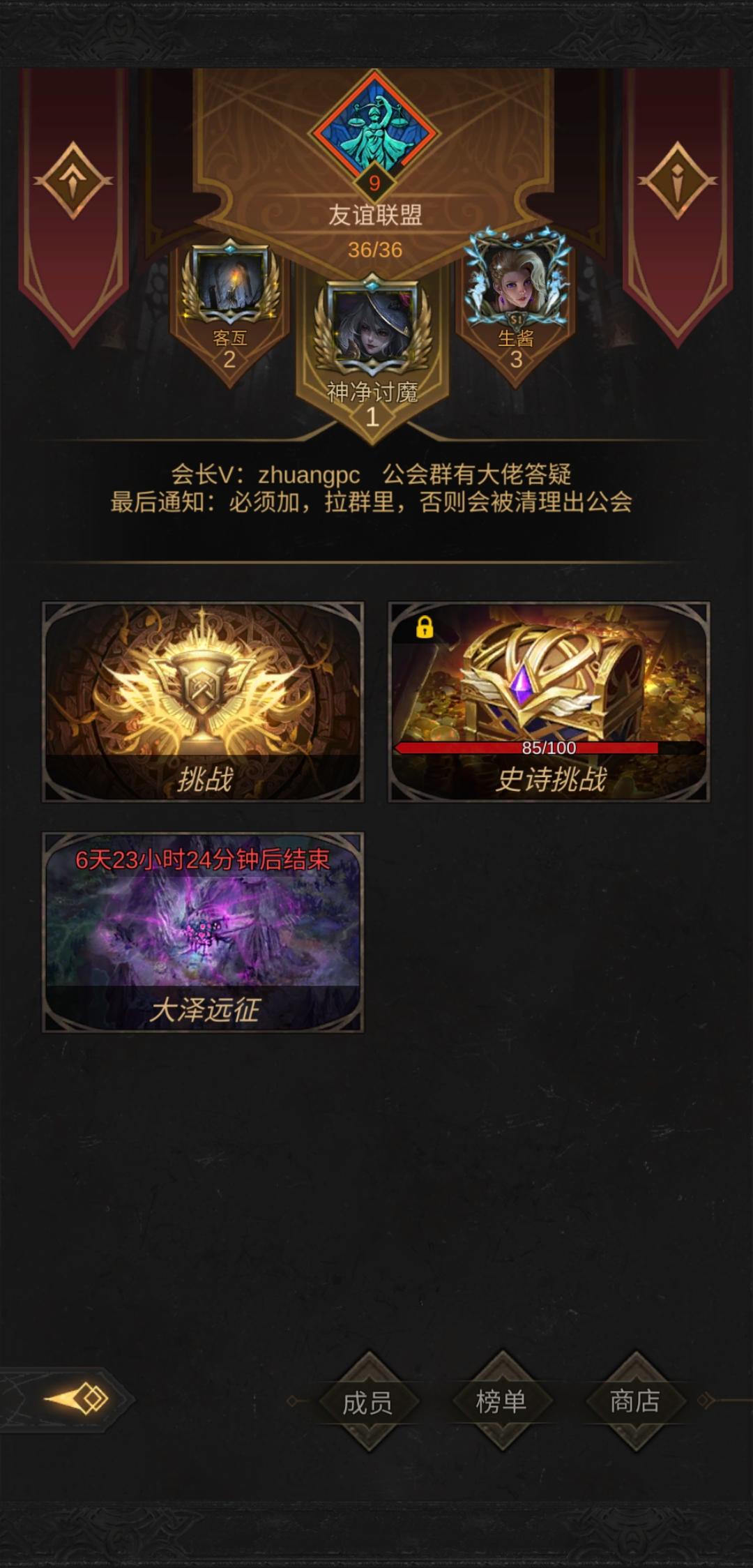 s2赛季37名的九级公会“友谊联盟”,一周后升十级。招35万以上面板玩家加入。可加群聊天吹牛逼。有大佬坐镇答疑解惑。期待你的到来