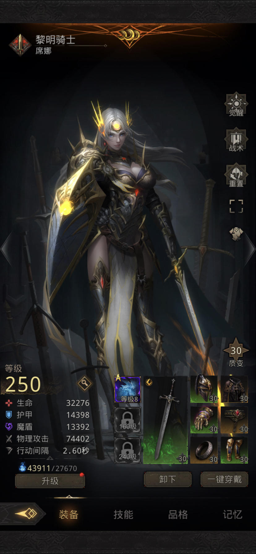 这是目前的练度 卡在渡海了女刺客也打不过咋办接下来练成武器换什么好 已经有了豆剑和豆仗了 看好多人都玩的燕子可惜我没有