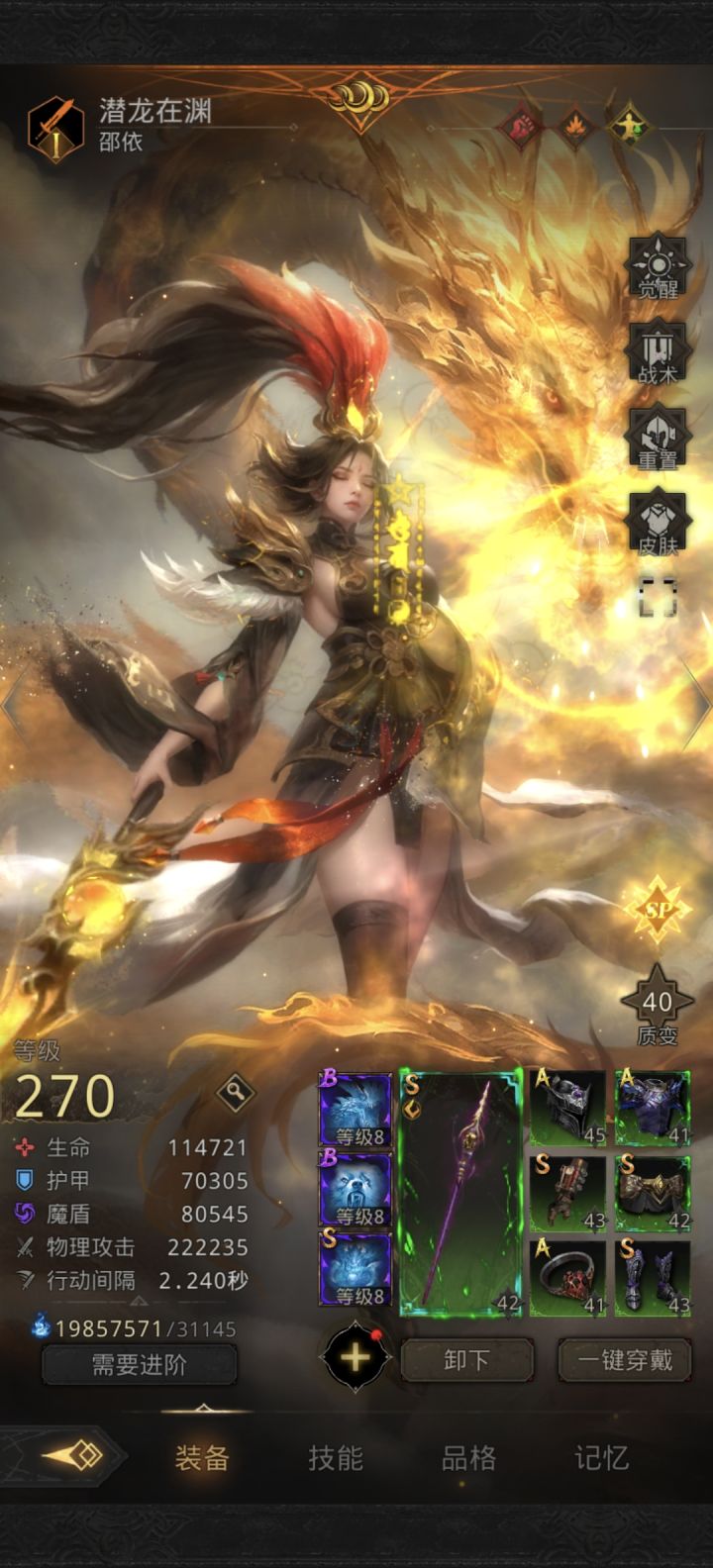 刚打完秘境10解锁的新图,第一次打的时候时间结束了才破盾,第二次打没想着能过,仅是铸魔人换了告死鸟,站位也没变,甚至没吃食物就过了思路解析↓血盾3亿出头,三月的夜莺输出足够了邵依输出不算太高,240的链接刚好能站得住,20%>护甲/魔盾<50%的时候每次命中➕1层破甲,在这之间叠满10层破甲,护甲/魔盾掉到20%以下触发兵解,就会解除锁暴击倍率,剩下就是保持挂毒不断开局告死鸟