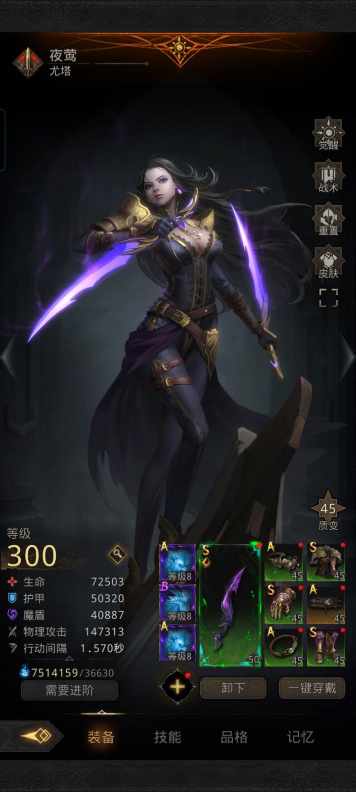 阵容调整和装备什么的建议都可以60元档一枚,现在卡在银月城。装备什么的还没搞,就把千面的武器整成橙色了。现在还觉醒一个,不知道觉醒哪个角色了#地下城堡3魂之诗
