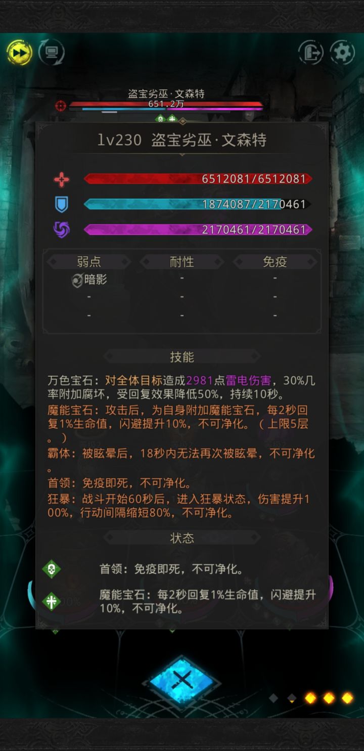 在西托比亚城邦的神居遗址打boss的时候,上阵了晨星和暗鸦。我看这两个角色的战吼看上去都是百分百会附加眩晕,麻痹、致盲(因为和其他角色的技能说20%或其他概率触发某个debuff的描述不同),在实际打的时候,有发现暗鸦和晨星战吼了,而boss并没有被打上debuff的样子,boss的表现 (尤其是应该眩晕)也的确是没中debuff。我看boss的技能也没有净化这个功能。这是我游戏版本资源的问题