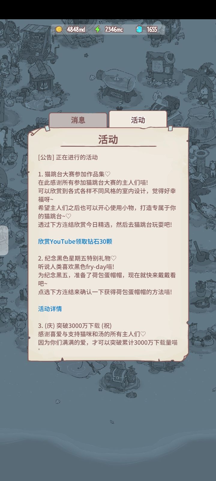 本作是今年9月中旬在海外发行的国际服小游戏。实在是太可爱了,太治愈了,蛮喜欢这种类型的放置游戏的。刚开服的时候没有中文,过了一段时间中文也有了。还有不得不再说一句,猫猫各种动作动来动去,实在是太可爱了,还有音乐也是特别温馨治愈。唯一的担心就是下雨的时候,猫猫没有地方可以躲雨,希望后面官方可以考虑一下。=下载方法=IOS:可以在很多地区的苹果商店找到本作(除了国区),搜中文“猫和汤”或英