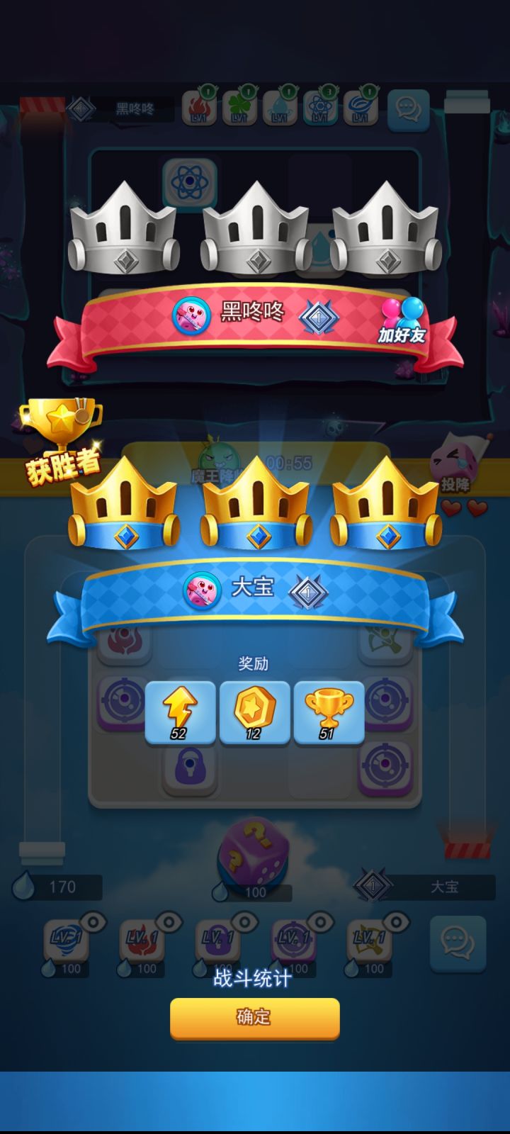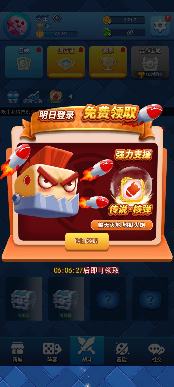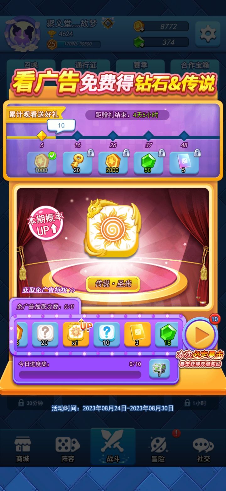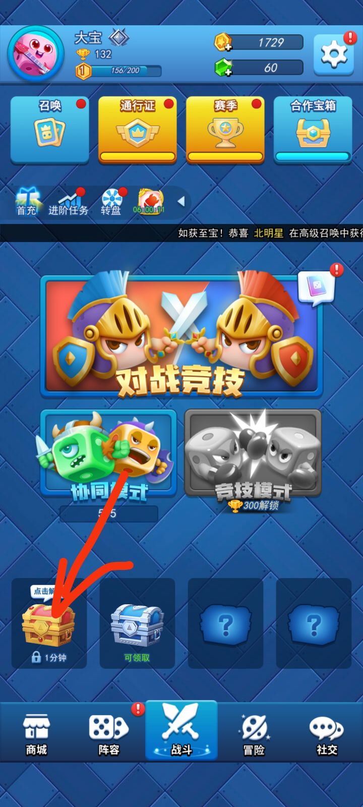 该游戏独树一帜,仅仅只要49m就可以开始一把刺激的对战。这放在同类型游戏是相当炸裂。好了,我们开始来一把紧张刺激的游戏。前期点中间的骰子不断铺场就行。又是一把轻而易举的胜利。获得一个宝箱,点击解锁。还有通过看广告快速领取。就刚才的对战赢十把,就会有10张up池卡。就可以点开召唤,抽概率up池。然后点进阶任务,完成后领取大量奖励。平时把签到签一签,通行证和赛季、任务点一点。最后,兑换码