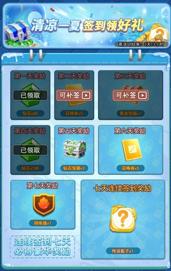 清凉一夏!签到领好礼!小伙伴们不要忘记每天签到领取奖励哦!连续七天签到还可以获得传说骰子一个!#欢乐对决#游戏福利