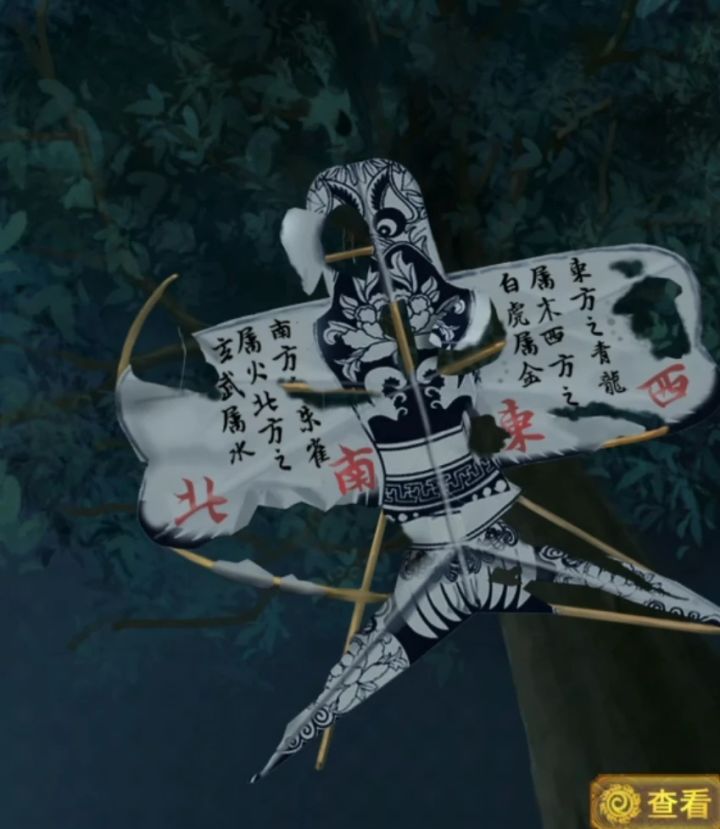 剧情过后拿走中间偏右的竹竿,然后查看右边树上的风筝,使用竹竿拿到风筝,看到线索北南东西,北=水,南=火,东=木,西=金,所以我们获得了四个属性密码水火木金,之所以知道不是四圣兽因为已经看到过锁了啊,不过我们不着急进门先调查一下外面院子。查看左边的院子,棋盘上红绿色很明显,我们可以画个图红色用0绿色用x,也可以等用的时候再来看,左边院子窗子上有奇怪的颜色,后面我们估计要找些镂空的东西来看,地上的炉