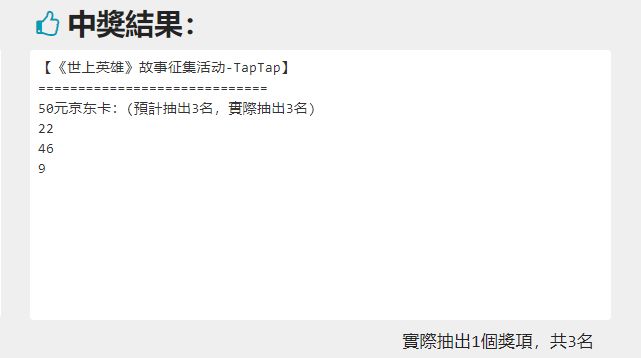 大家好呀,距离《世上英雄》众筹开启已经过去了半个月,这期间的众筹总金额已经达到14.5万元,参与人数超过了2400人,我们真的非常感动非常高兴,能受到这么多玩家的喜爱,是我们继续做好游戏的巨大动力!之前在众筹开启的抽奖活动已结束,事不宜迟,马上公布众筹开启活动的开奖吧!活动原帖:我们总共收到了65楼的回复,筛选了不符合条件的楼层,按剩余符合条件的楼层进行随机抽奖,以下是中奖玩家的信息,和对应