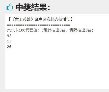 大家好呀,《世上英雄》摩点创意档支持已经步入尾声啦,切实地感受到大家的热情,虽然没有突破四位数的“看好”,但依旧有很多人默默支持着我们,真的非常感谢大家!之后《世上英雄》摩点众筹也会正式开始,敬请期待!事不宜迟,马上公布创意档活动的开奖吧!活动原帖:我们总共收到了133楼的截图回复,筛选了不符合条件的楼层,按剩余符合条件的楼层进行随机抽奖,以下是中奖玩家的信息,和对应的抽奖截图凭证。首先是