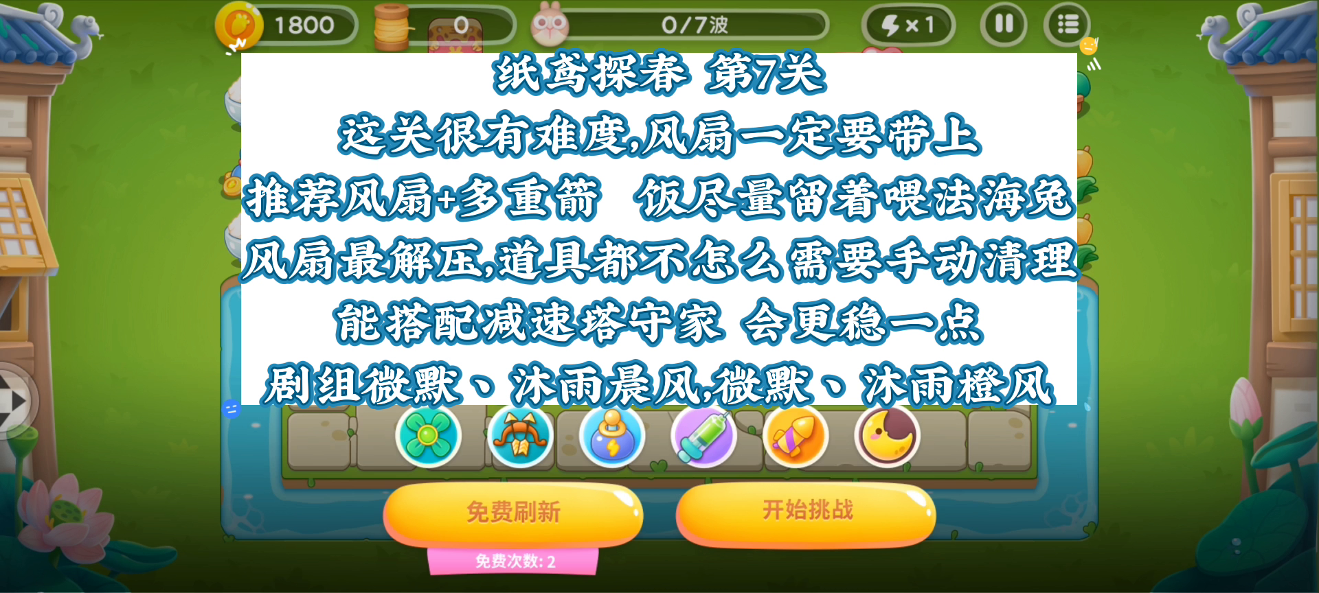 纸鸢探春 第4关 这关有点难,求稳一定要配合减速 推荐魔法球,风扇,多重箭,加一个减速塔 全清虽然没有奖励,但想要全清建议多使用暂停 会更稳一点